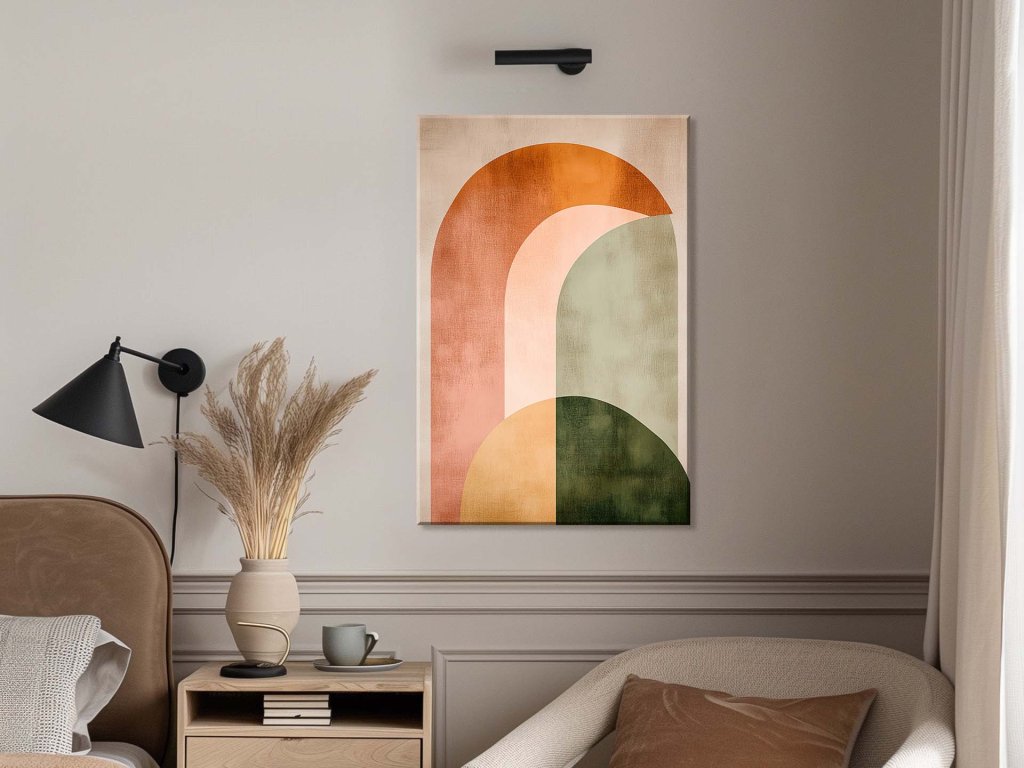 Obraz predstavuje kombináciu jednoduchých geometrických tvarov, ktoré sa prelínajú v jemných pastelových odtieňoch. Tóny oranžovej, ružovej a zelenej spolu vytvárajú príjemný a pokojný kontrast. Minimalistický štýl zameraný na tvar a farbu prináša do priestoru pocit rovnováhy a vizuálnej čistoty.