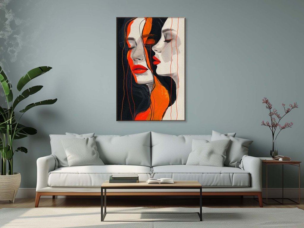 Obraz predstavuje dva prekrývajúce sa ženské profily s výraznými oranžovými a sivými tónmi, oddelené dynamickými červenými líniami. Kontrastné farby zdôrazňujú jedinečnosť každého profilu, zatiaľ čo použitie štetca dodáva kompozícii živý a expresívny pocit. Dynamické línie vnášajú do obrazu pocit pohybu a energie.