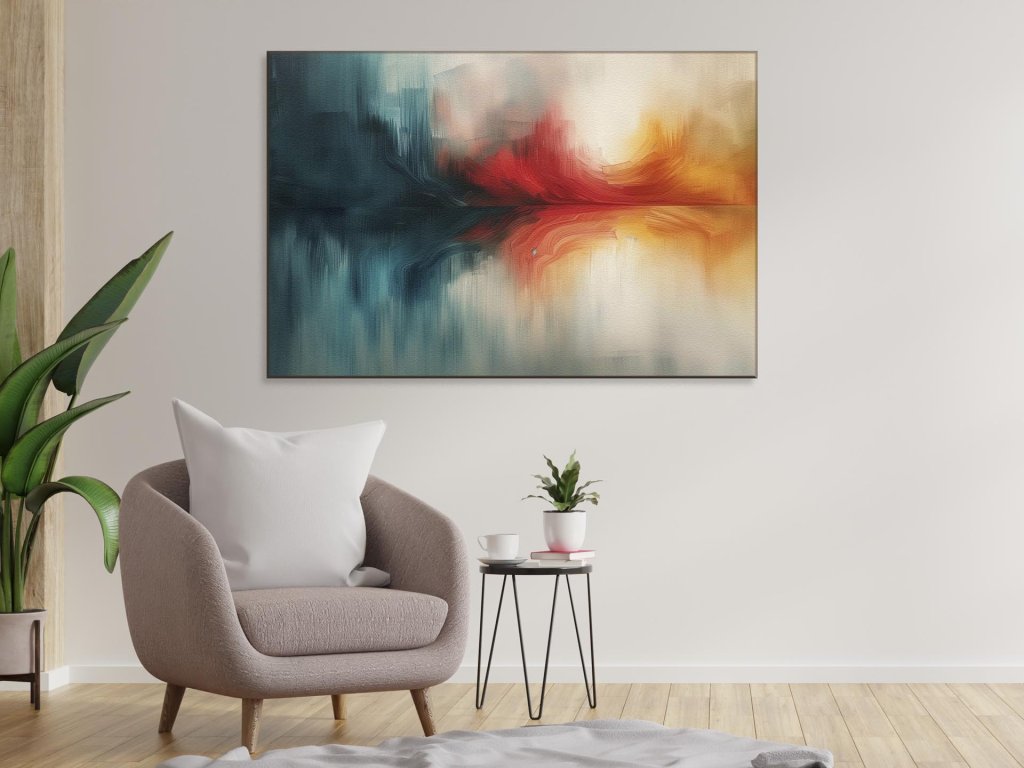Obraz je abstraktné dielo, ktoré evokuje pocit pokojného západu slnka odrazeného na vodnej hladine. Hladké, plynulé pohyby a zmes teplých a studených tónov vytvárajú ilúziu tichého večera, kde čas akoby zastal. Kontrast medzi horúcimi červenými a oranžovými pruhmi a chladnými modrými a šedými tónmi je ako vizuálne vyjadrenie tepla dňa, ktoré ustupuje nočnému chladu.