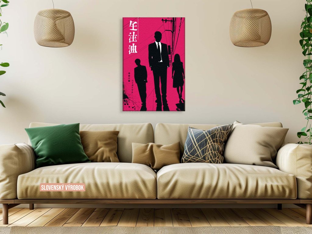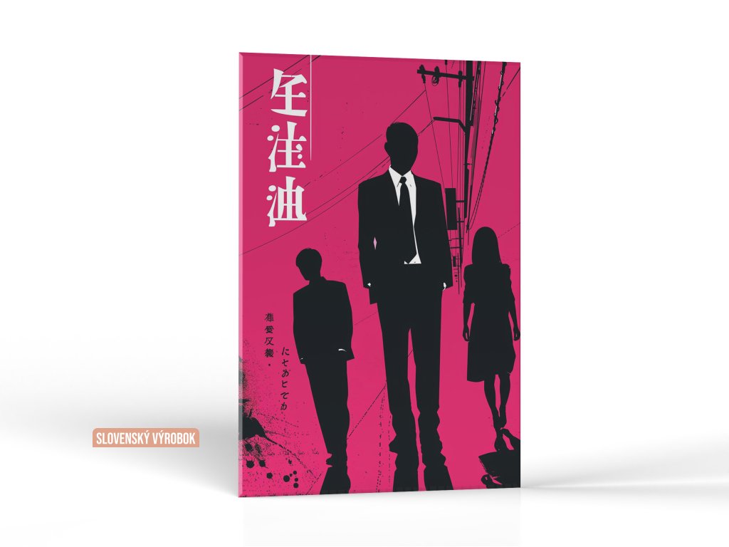 Obrázok predstavuje troch ľudí zobrazených ako čierne siluety na ružovom pozadí s japonským textom, čo naznačuje príbeh alebo kontext v ázijskom prostredí. Dominantné použitie ružovej a kontrast čiernej vytvára výrazný vizuálny efekt. Siluety a kompozícia dávajú dojem hĺbky a mnohoznačnosti.