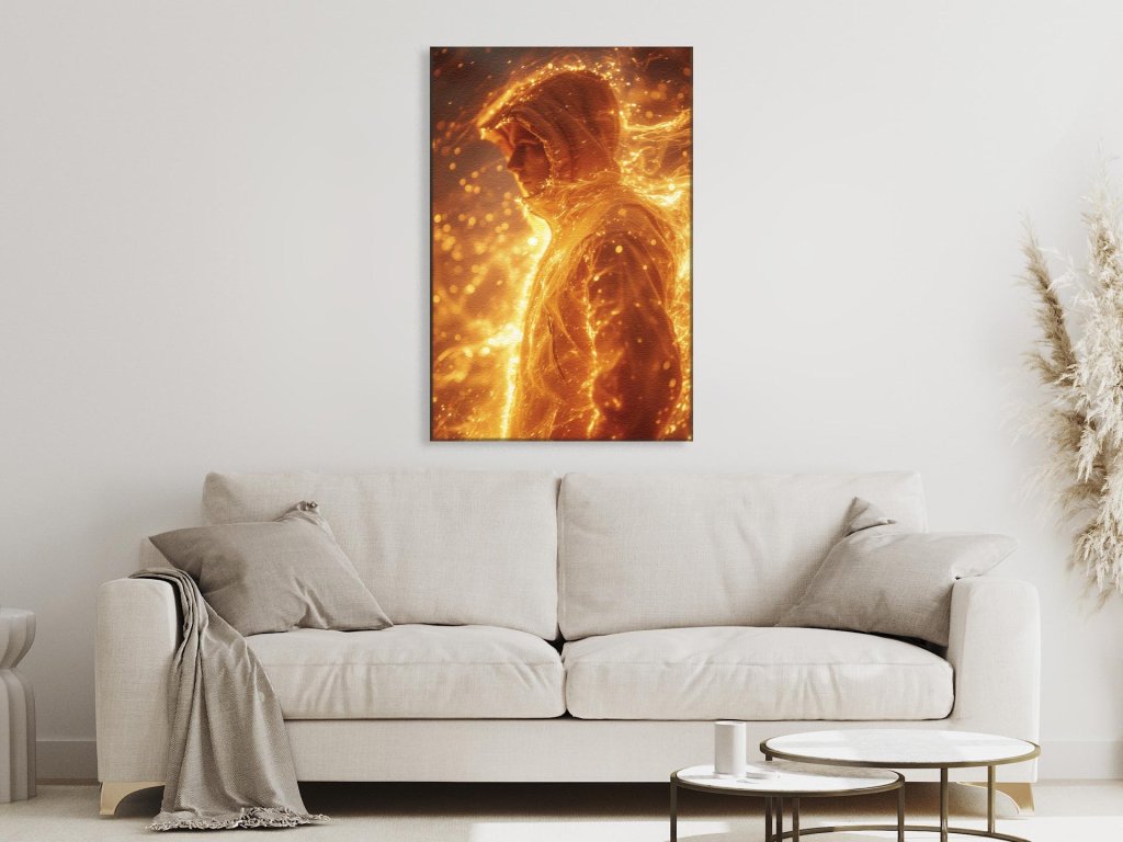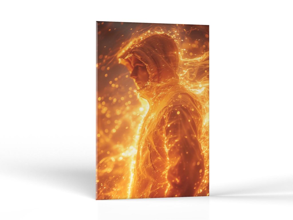 Postava oblečená v kapucni je zahalená v ohnivom svetle, ktoré vytvára pôsobivú auru okolo nej. Svetlo iskrí a tancuje po celej jej postave, odhaľujúc jemné kontúry jej profilu a dodávajúc scéne éterický nádych. Tento obraz vyžaruje silu a záhadnosť, pričom použité zlaté tóny pridávajú hlboký vizuálny rozmer.