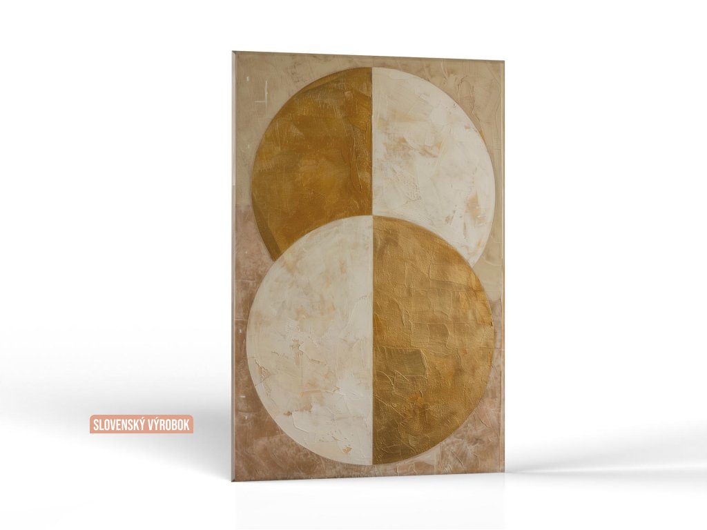 Tento abstraktný obraz zobrazuje dva prekrývajúce sa kruhy v zlatých a krémových odtieňoch. Farby a textúry sa harmonicky prelínajú, čím vytvárajú pocit rovnováhy a pokoja. Kombinácia zlatej a neutrálnej farebnej palety dodáva obrazu elegantný a sofistikovaný vzhľad.