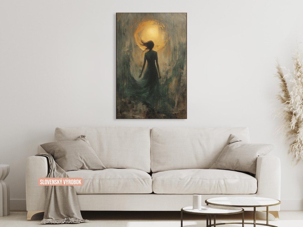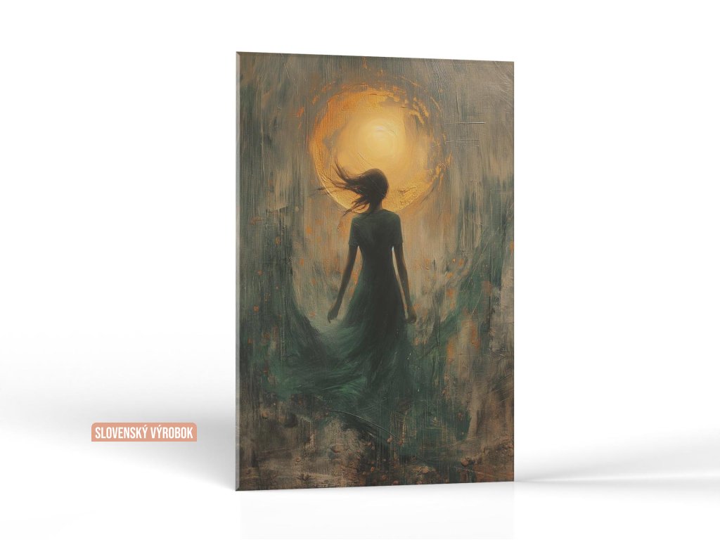 Žena v tmavozelenom šate kráča smerom k silno svietiacej kruhovej formácii, ktorá rozptyľuje svetlo na temnom pozadí. Jej vlasy a šaty sú roztancované vo vetre, čo dodáva dynamiku scéne. Obraz je vyjadrený expresívnymi štetcovými ťahmi, ktoré pridávajú textúru a hĺbku, a atmosféru tajomnosti a nádeje.