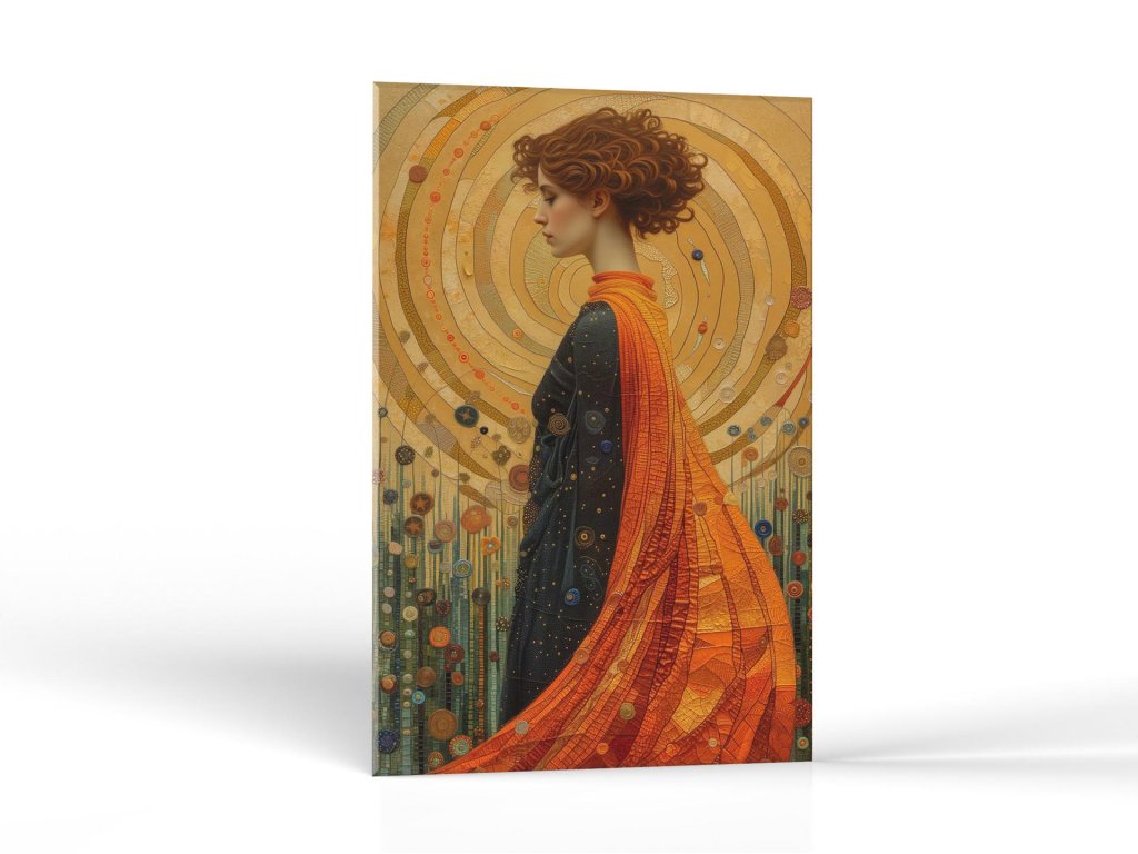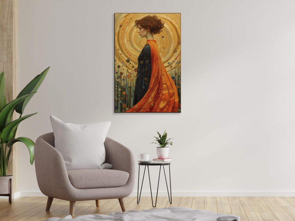 Profilový portrét ženy s hustými kučeravými vlasmi, oblečenej v tmavom šate s oranžovým šálom, proti pozadiu so secesnými vzormi. Obrázok je plný geometrických tvarov a krúžkov, ktoré vytvárajú hypnotický efekt. Farby a štýl pripomínajú práce Gustava Klimta, s výrazným dôrazom na detail a textúru.