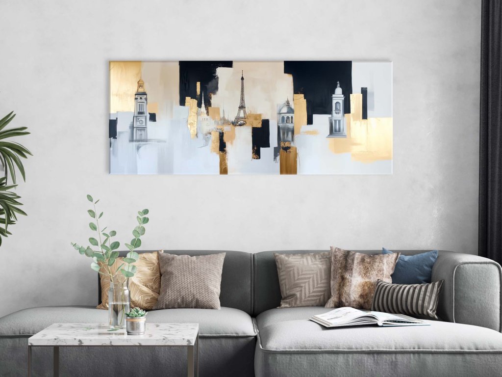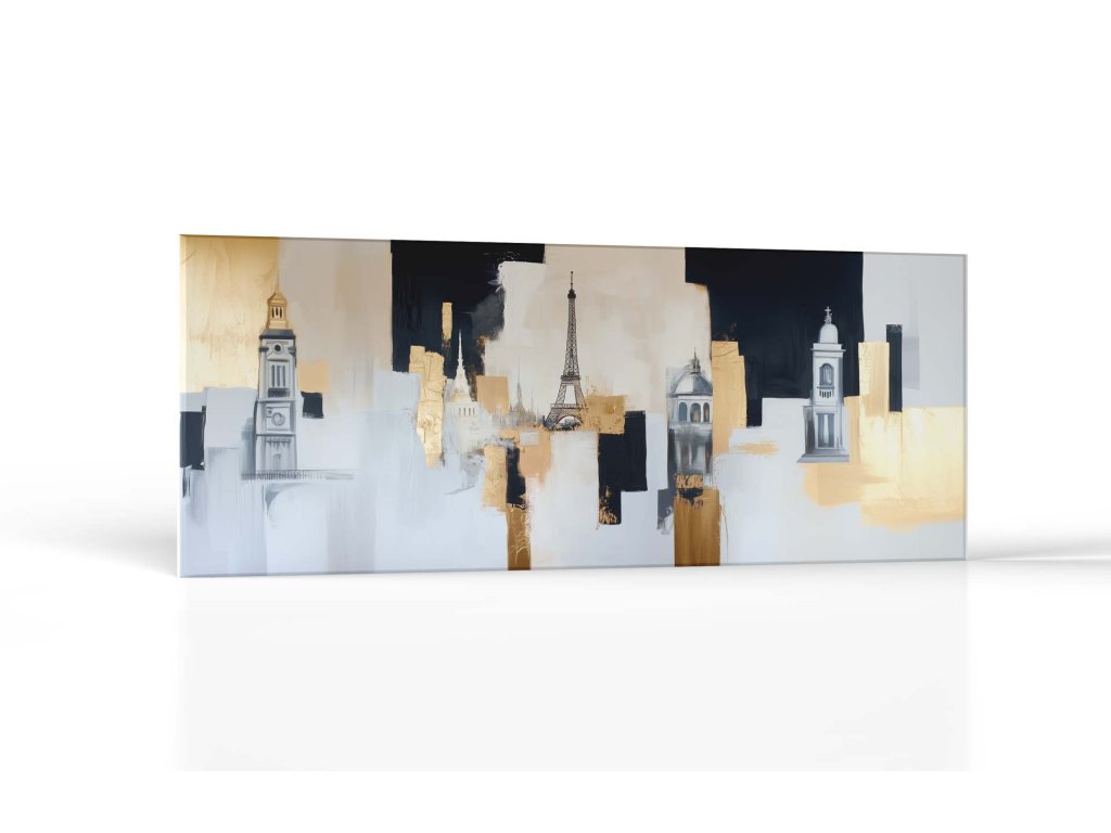 Tento obraz stvárňuje jedinečnú harmóniu medzi historickou architektúrou Paríža a moderným abstraktným umením. Eiffelova veža, Sacré-Cœur a ďalšie ikonické stavby sú zasadené do zlatej a čiernej farebnej palety, ktorá zdôrazňuje ich eleganciu a význam. Celá kompozícia pôsobí ako umelecká pocta parížskej kultúry, spája tradičné a súčasné prvky do jedného diela.