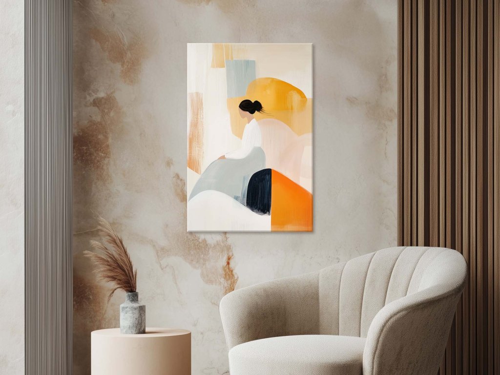 Obraz zobrazuje ženu s jednoduchými, no elegantnými črtami, sediacu v tichom a introspektívnom postoji. Jej postava je zasadená do prostredia zloženého z abstraktných geometrických plôch v teplých a neutrálnych odtieňoch, čo vytvára pocit pokoja a súladu. Hoci tvár postavy nie je detailne vykreslená, jej gestá a celková atmosféra obrazu hovoria o hĺbke emócií a vnútornom svete.