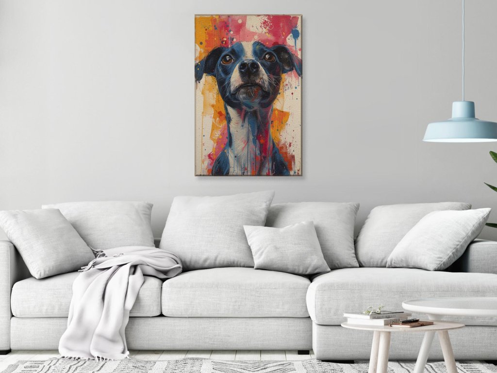 Tento obraz zobrazuje realisticky namaľovanú hlavu psa s jemne vyjadrenými črtami tváre, ktorá vyniká na pozadí plnom živých abstraktných škvŕn a kvapiek farby. Farebné škvrny zahŕňajú odtiene oranžovej, červenej, modrej a žltej a dodávajú celému dielu energický a hravý nádych. Vizuálna kompozícia spája realizmus a abstrakciu, čo robí obraz vizuálne zaujímavým a emocionálne pútavým.
