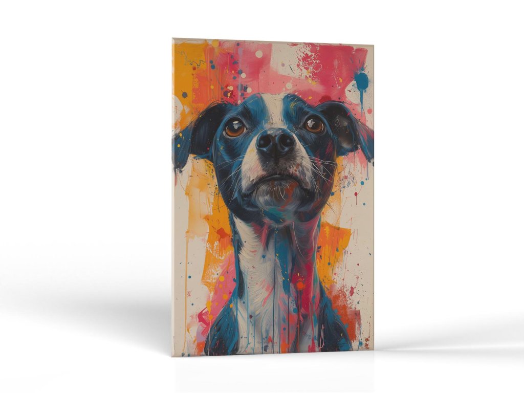 Portrét psa s abstraktnými farebnými škvrnami na pozadí.