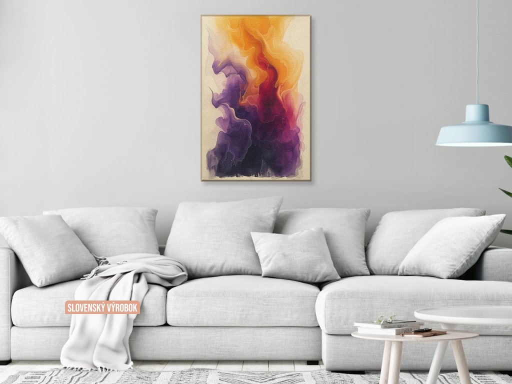 Obraz ukazuje silné vizuálne kontrasty pripomínajúce plamene, ktoré sa vinú hore v plynulých, teplých oranžových a žltých líniách a prechádzajú do chladnejších, hlbších fialových a čiernych odtieňov v dolnej časti. Textúra obrazu sa zdá byť tekutá a organická, s jemnými prechodmi farieb, ktoré vytvárajú dojem hĺbky a pohybu. Celkový efekt je dramatický a pútavý, s pocitom, že obraz je živý.