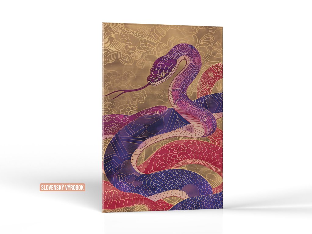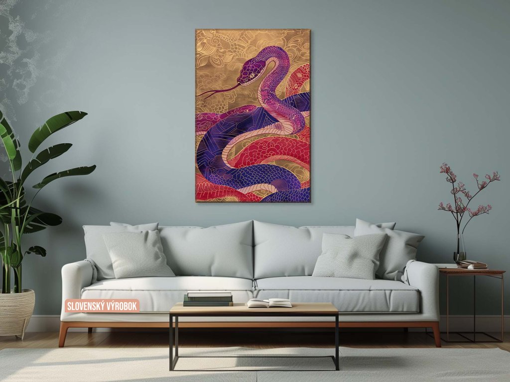 Na obraze sú tri hady prepletené v zložitom vzore na pozadí zdobenom jemnými zlatistými motívmi. Hady majú rôzne farby, vrátane odtieňov purpurovej, červenej a modrej, a každý z nich má výraznú šupinatú textúru. Dynamika a elegancia hadov kontrastuje s pokojným a rytmickým pozadím, čo vytvára pocit hĺbky a textúry.