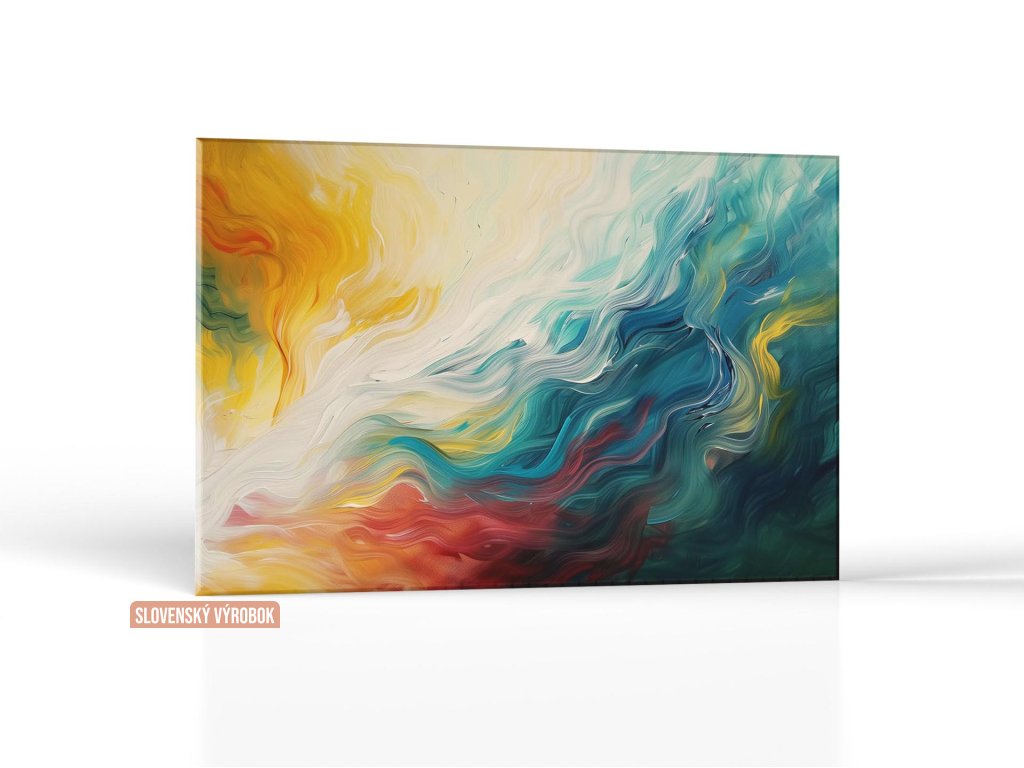 Tento obraz zobrazuje dynamickú kompozíciu, v ktorej sa farby pretáčajú a prelínajú v neustálom pohybe. Teplé tóny žltej a červenej kontrastujú s chladnými odtieňmi modrej a zelenej, vytvárajúc pocit tepla a chladu, svetla a tmy. Plynulé línie a formy pripomínajú prirodzené vzory a pohyby, akoby sme boli svedkami tanca prírody alebo odrazu ľudskej emócie, čím obraz nadobúda takmer hypnotický charakter.