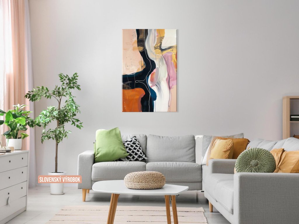 Tento obraz kombinuje rôzne farby a textúry, ktoré spolu tvoria harmonickú kompozíciu. Plynulé línie a prechody medzi farbami vytvárajú pocit pohybu a dynamiky, pričom svetlé a tmavé tóny sa navzájom dopĺňajú. Celkový efekt obrazu pôsobí moderným a esteticky príjemným dojmom, ktorý zaujme pozorovateľa svojou originalitou a kreativitou.