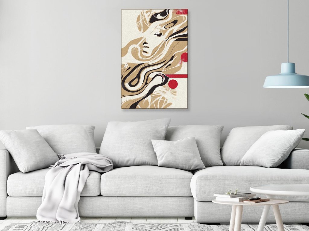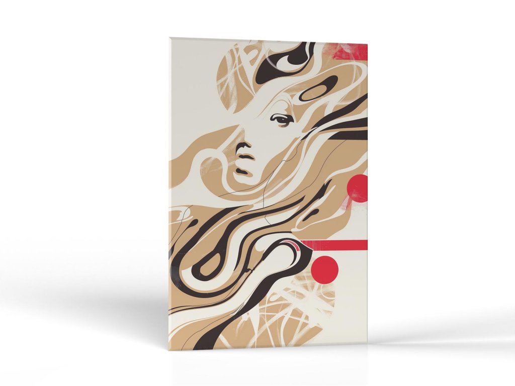 Tento obrázok, nazvaný "Plynutie myšlienok", je umenie plné energie a pohybu, zachytávajúce abstraktné zobrazenie ľudskej tváre a prúdenie energie, ktoré od nej vychádza. Dynamické krivky a línie spolu s hlbokými a teplými farbami vytvárajú pocit života a pohybu. Červené akcenty na pozadí dodávajú dielu hĺbku a vibráciu, zatiaľ čo tmavé tóny poskytujú kontrast a hĺbku.