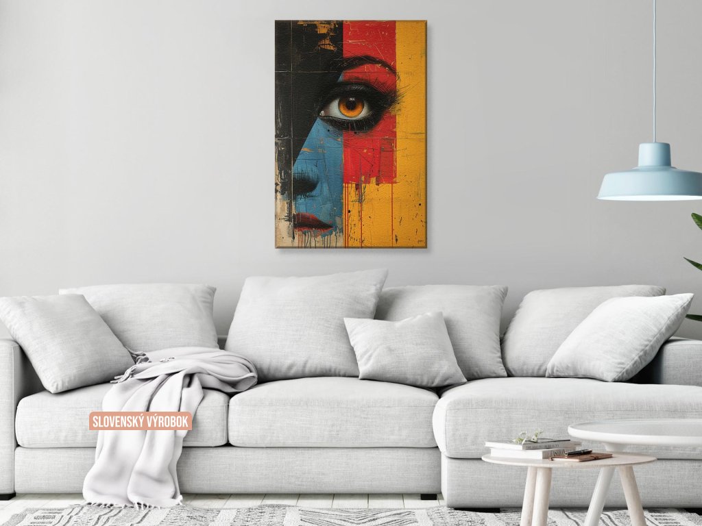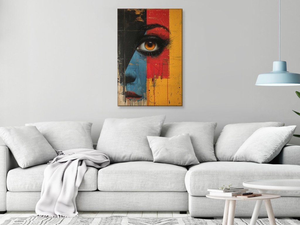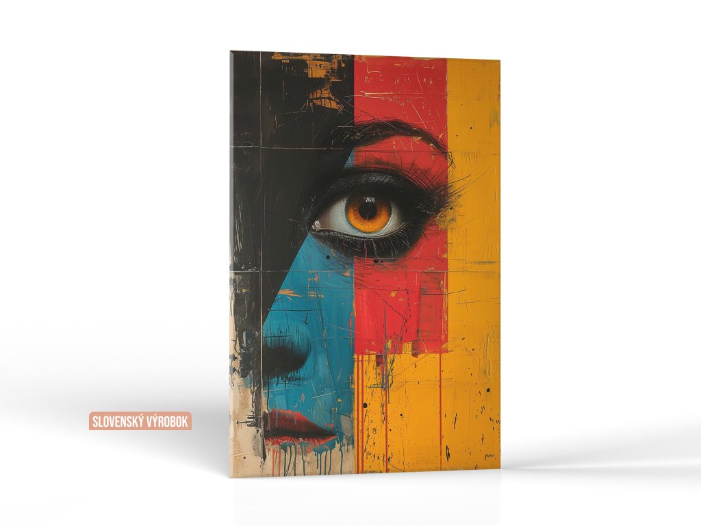 Na tomto umeleckom diele je zobrazené ľudské oko s intenzívnym pohľadom, umiestnené na pozadí tvorenom žltými, červenými a modrými geometrickými blokmi. Vizuálne bohaté textúry a škrabance na obraze dodávajú dielu hlboký a surový výraz, kým červené a modré striekance okolo oka pridávajú pocit emócie a dynamiky.