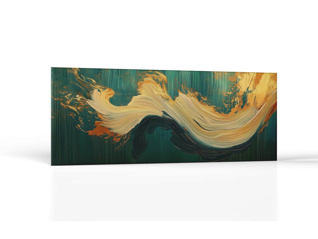 Obraz zobrazuje víriacu hmotu v odtieňoch zlatej, smaragdovej a hlbokej čiernej, ktorá pôsobí ako energia zachytená v pohybe. Štruktúra ťahov štetca vytvára dojem ľudskej postavy, ktorá splýva s vetrom alebo vlnami, čím vzniká pocit harmónie a nekonečnej plynulosti. Farby dodávajú obrazu kontrast a emóciu, evokujúc silu prírody a voľnosť ducha.