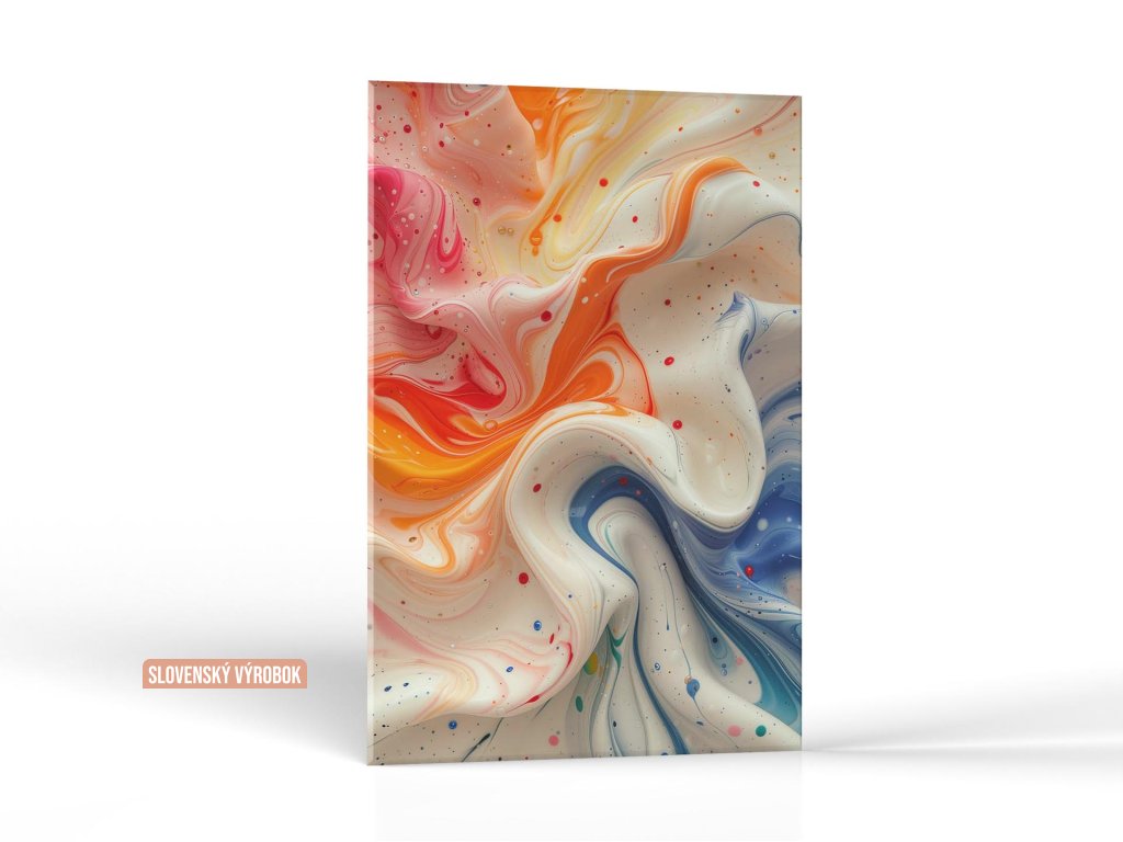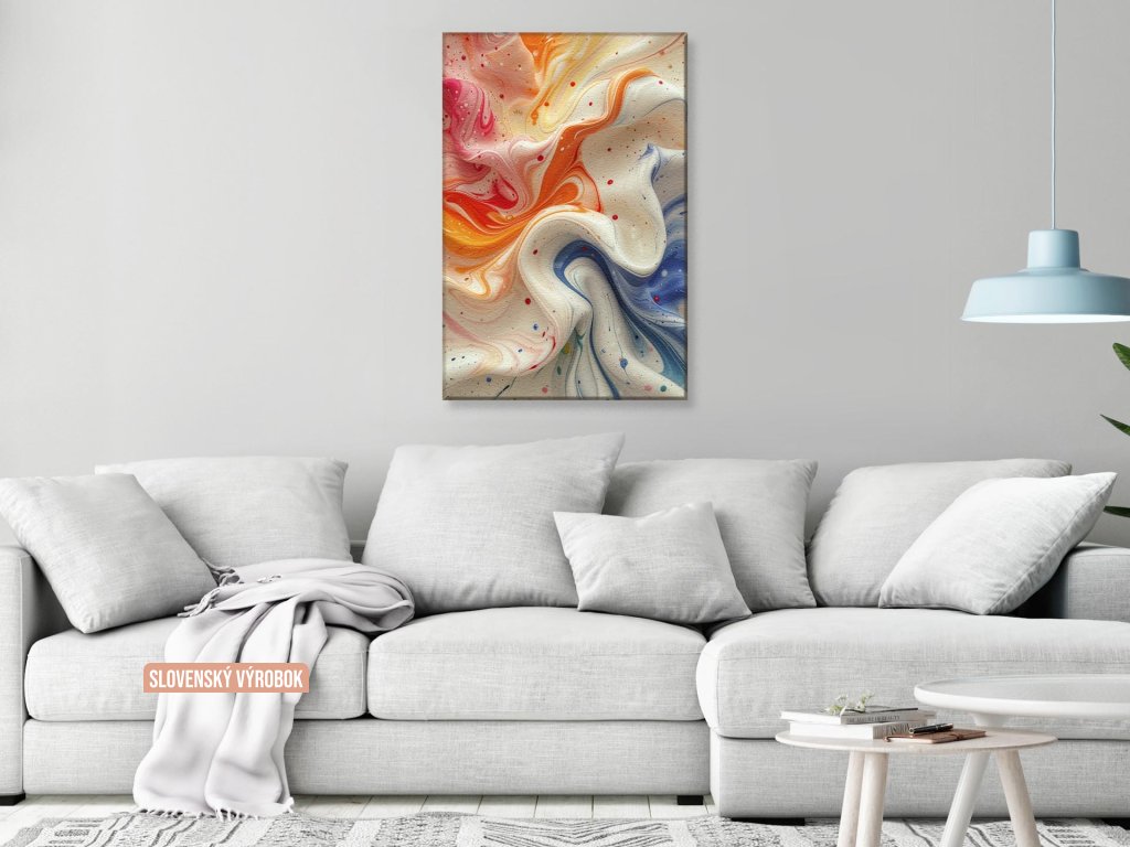 Na obraze je zachytené plynulé prelínanie teplých a studených tónov, ktoré vytvárajú abstraktný, ale harmonický vizuálny zážitok. Výrazné oranžové a jemné biele prúdy sa prelínajú so štipkou modrej, čím vytvárajú ilúziu hlbiny a pohybu. Drobné farebné akcenty v podobe bodiek dodávajú kompozícii nádych hravosti.