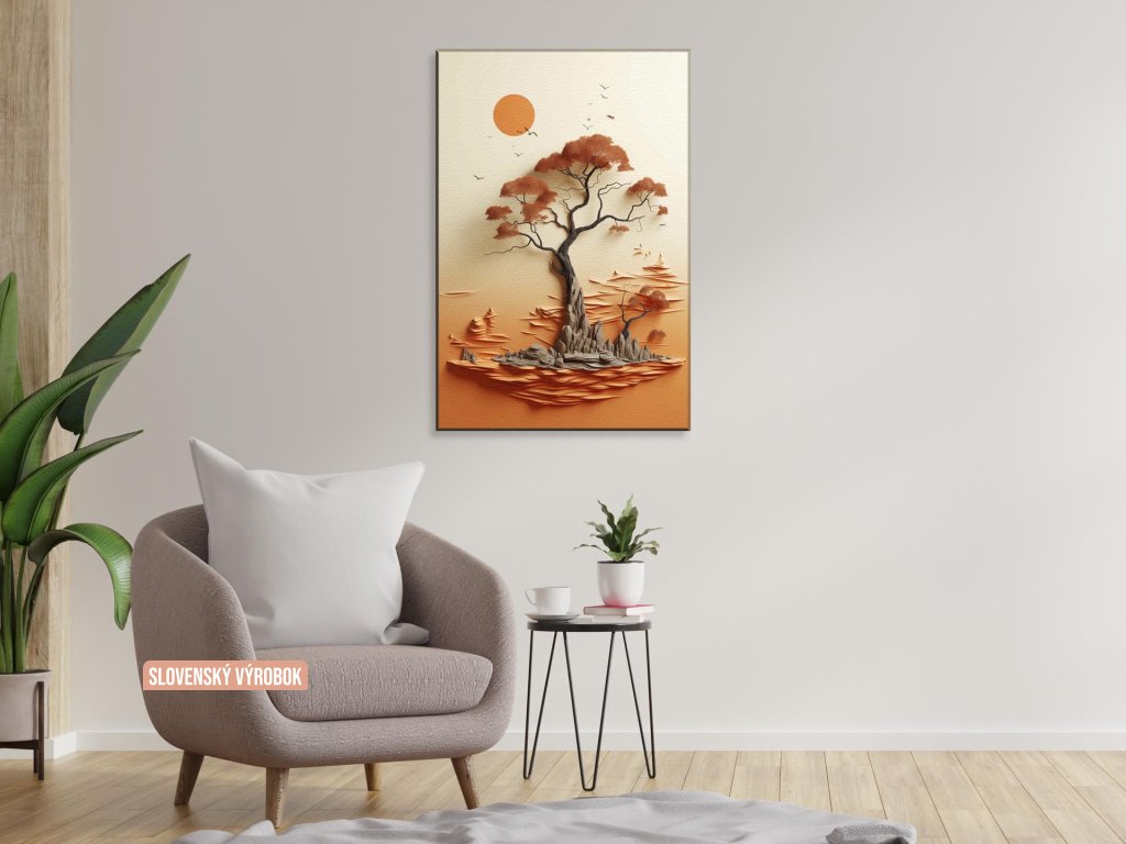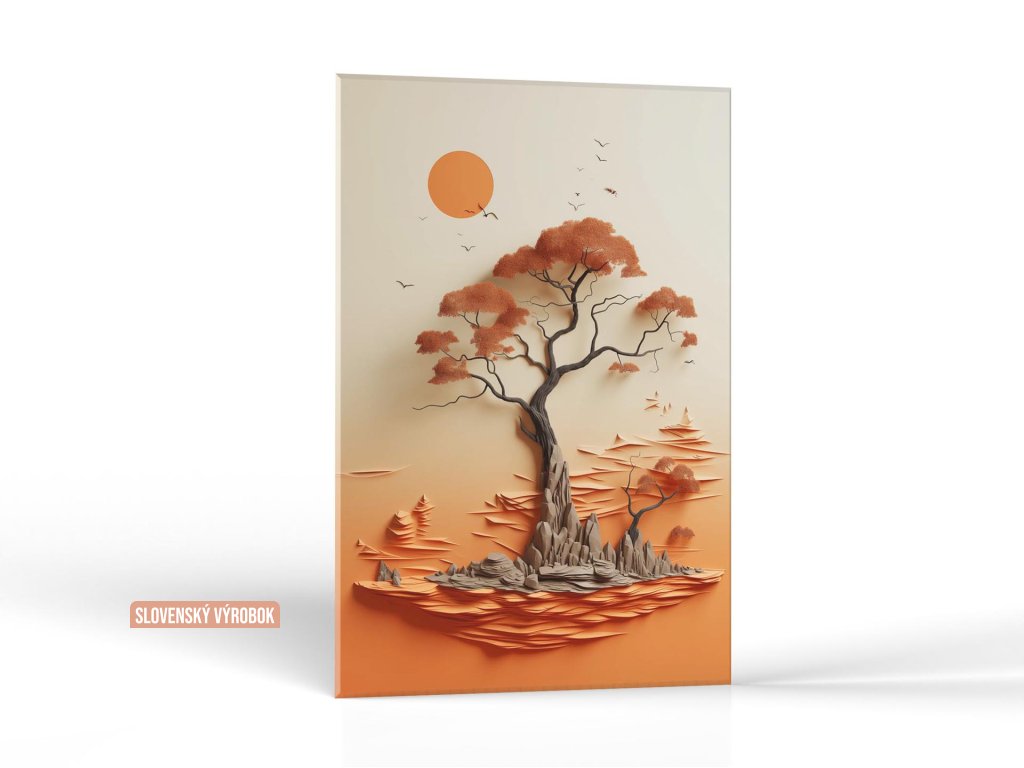 Stylizovaný obraz ostrova so stromom v odtieňoch oranžovej.
