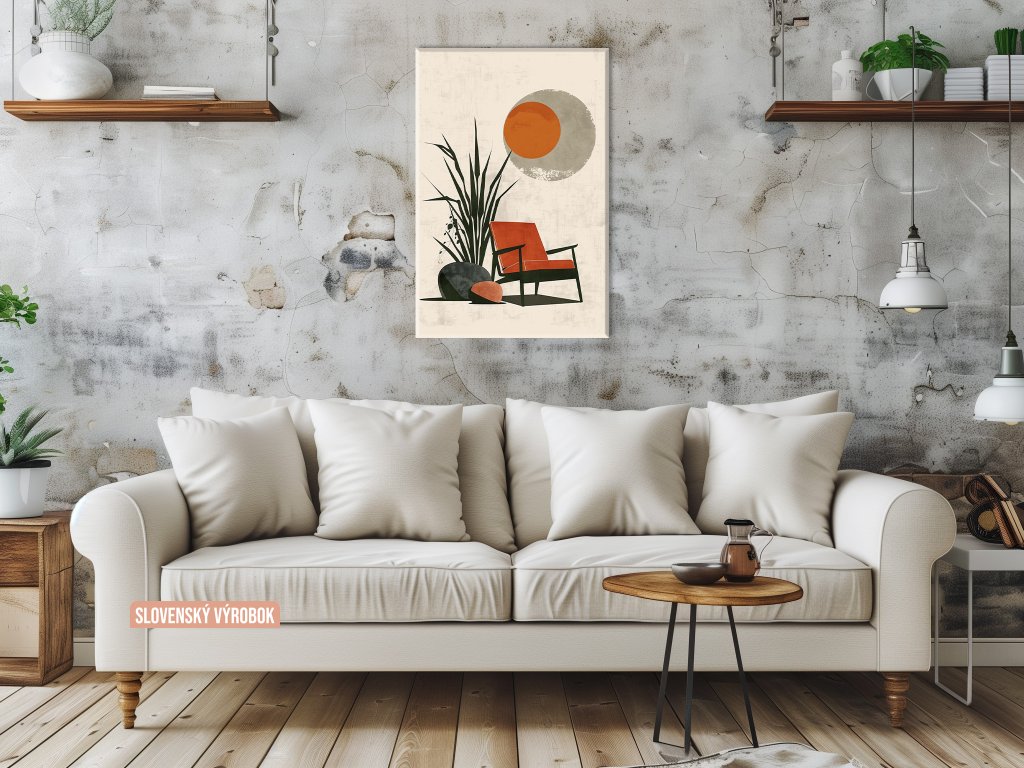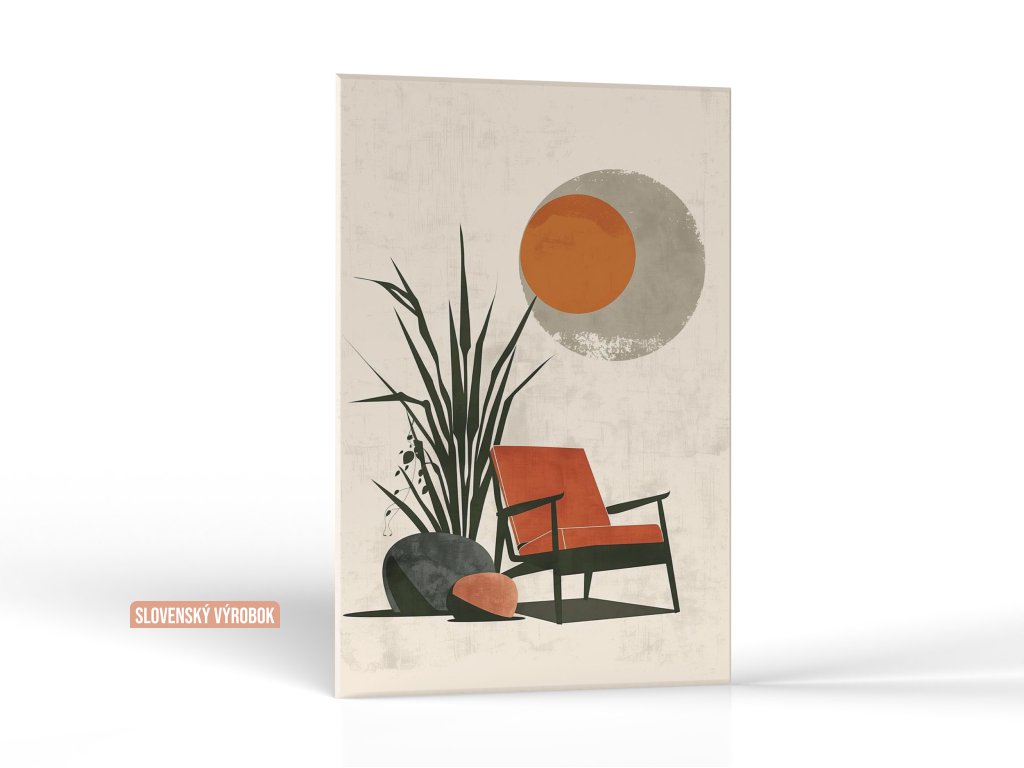 Tento obraz zachytáva pokojné a teplé poludnie s kreslom a rastlinou v popredí. Kreslo, výrazne oranžové, je umiestnené vedľa veľkých kameňov, ktoré pridávajú obrazu prírodný prvok. Nad kreslom sa vznáša veľké slnko, ktoré vytvára príjemnú a uvoľnenú atmosféru, ideálne pre oddych a relaxáciu.