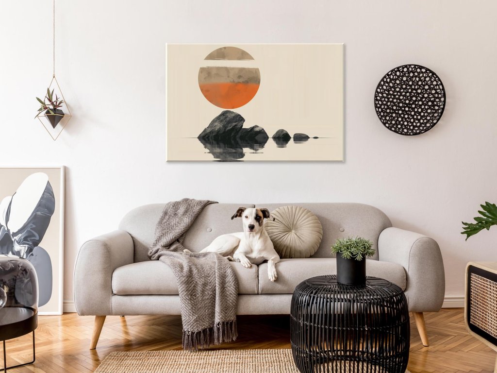 Tento obraz predstavuje minimalistickú kompozíciu, kde dominuje veľký abstraktný kruh, ktorý pripomína slnko zapadajúce nad pokojnou hladinou vody. Pod kruhom sú tmavé skaly, ktoré sa odrážajú na vode, čím vytvárajú pocit rovnováhy a pokoja. Farebné tóny sú jemné a tlmené, čo dodáva obrazu meditatívny a upokojujúci charakter.
