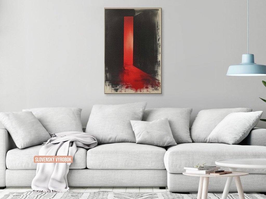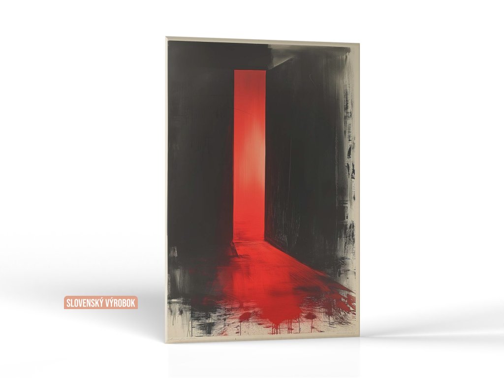 Tento obraz zobrazuje výrazný červený vertikálny pruh, ktorý sa javí ako svetelný lúč alebo portál, obklopený tienistými čiernymi a šedými škvrnami. Intenzívne farby vytvárajú dramatický kontrast, zatiaľ čo hrubé ťahy štetca pridávajú textúru a hĺbku. Celková atmosféra obrázka je záhadná a zamyslená, čo vyvoláva pocit zvedavosti.