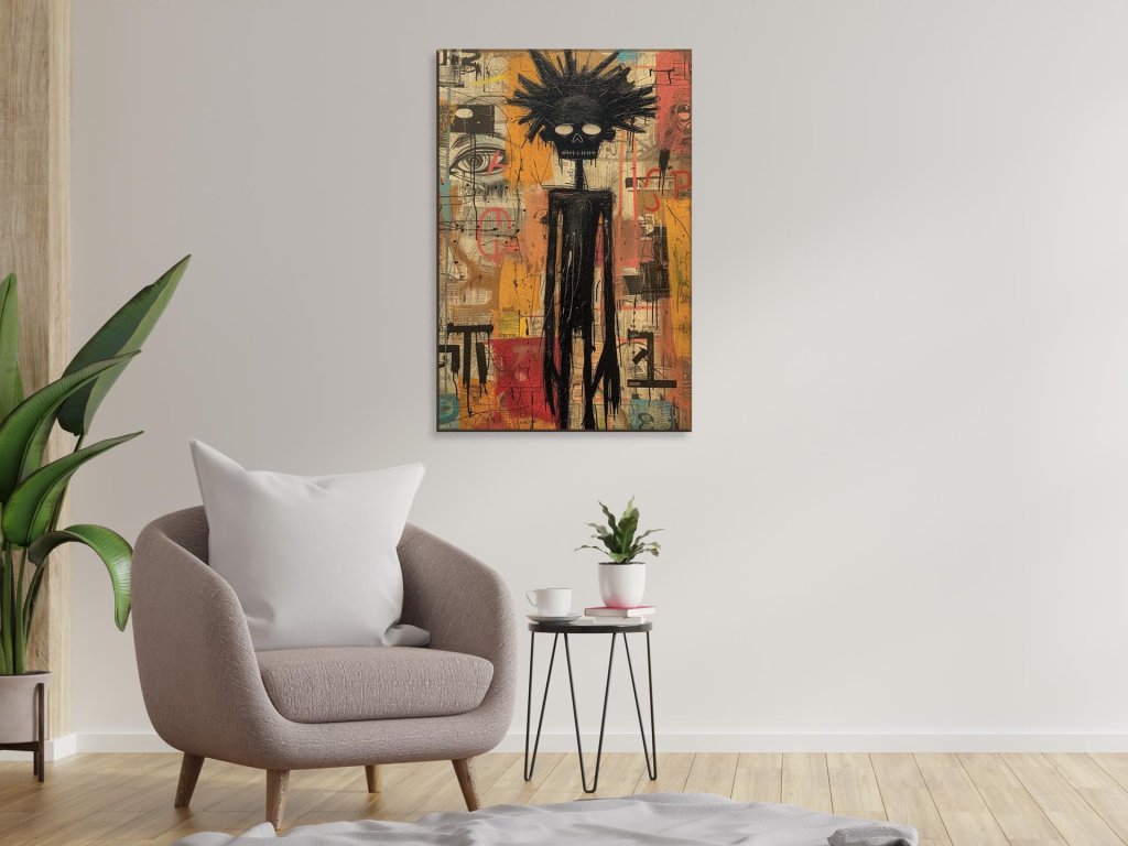 Na tomto expresívnom obraze je zobrazená stojaca postava s lebkou ako hlavou, vyznačujúca sa divokými, ostrými črtami a sýto čiernou farbou. Postava je umiestnená pred živým pozadím plným grafických symbolov, textu a žiarivých farieb, ktoré vytvárajú dojem vizuálneho chaosu a energie. Dynamické škvrny a čiary na celom obraze podčiarkujú surový a urbanistický charakter diela.