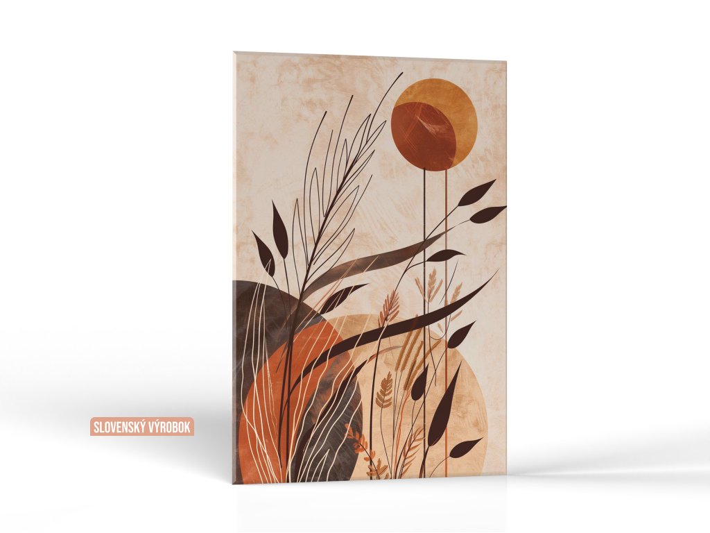 Tento obraz zachytáva krásu jesene prostredníctvom abstraktných línií a tvarov, ktoré evokujú listy a rastliny. Dominantné sú teplé farby oranžovej, hnedej a béžovej, ktoré vytvárajú pocit tepla a pokoja. Kompozícia obrazu je harmonická a vyvážená, čo prispieva k jeho estetickej príťažlivosti a vyvoláva príjemné pocity spojený s jesenným obdobím.