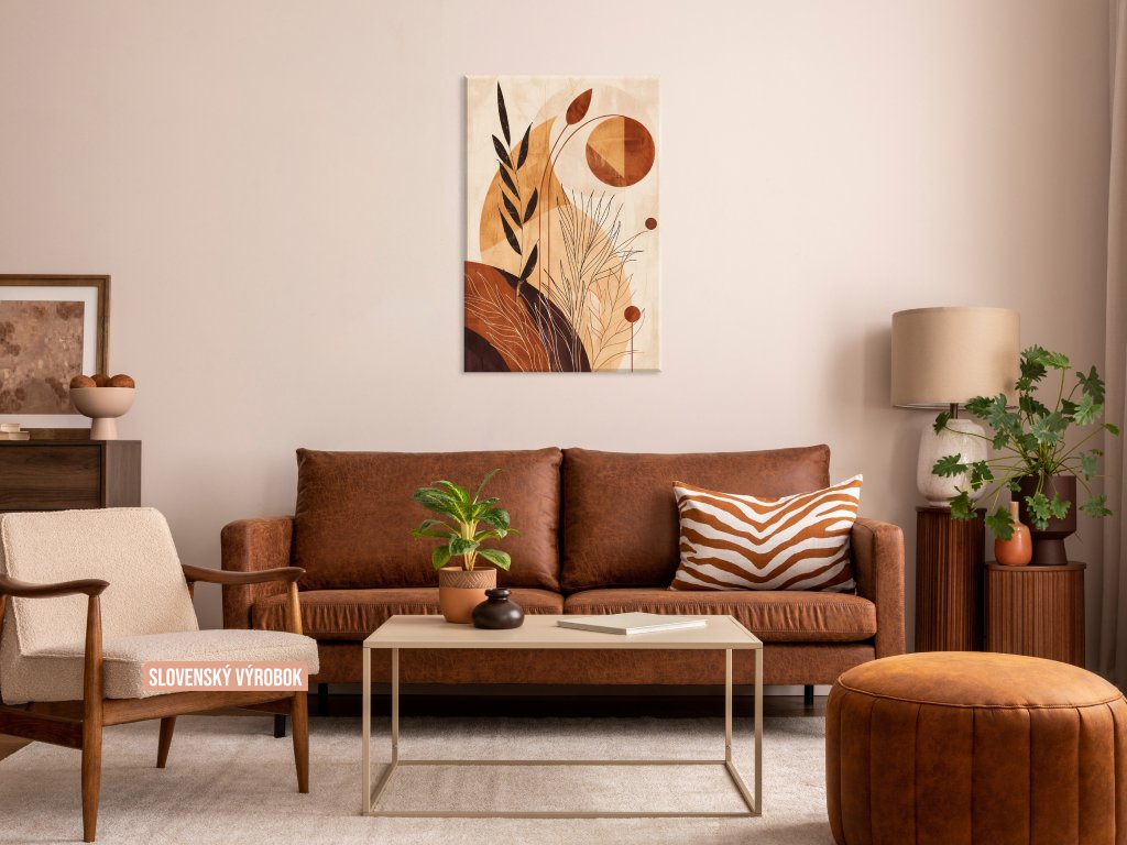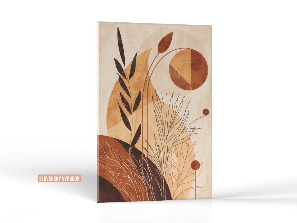 Tento abstraktný obraz zachytáva harmóniu prírody prostredníctvom jemných línií a tvarov, ktoré evokujú rastliny a listy. Teplé tóny oranžovej a hnedej vytvárajú pocit pokoja a rovnováhy. Celkový dojem z obrazu je harmonický a meditatívny, pripomínajúci pokojnú prírodnú scenériu.
