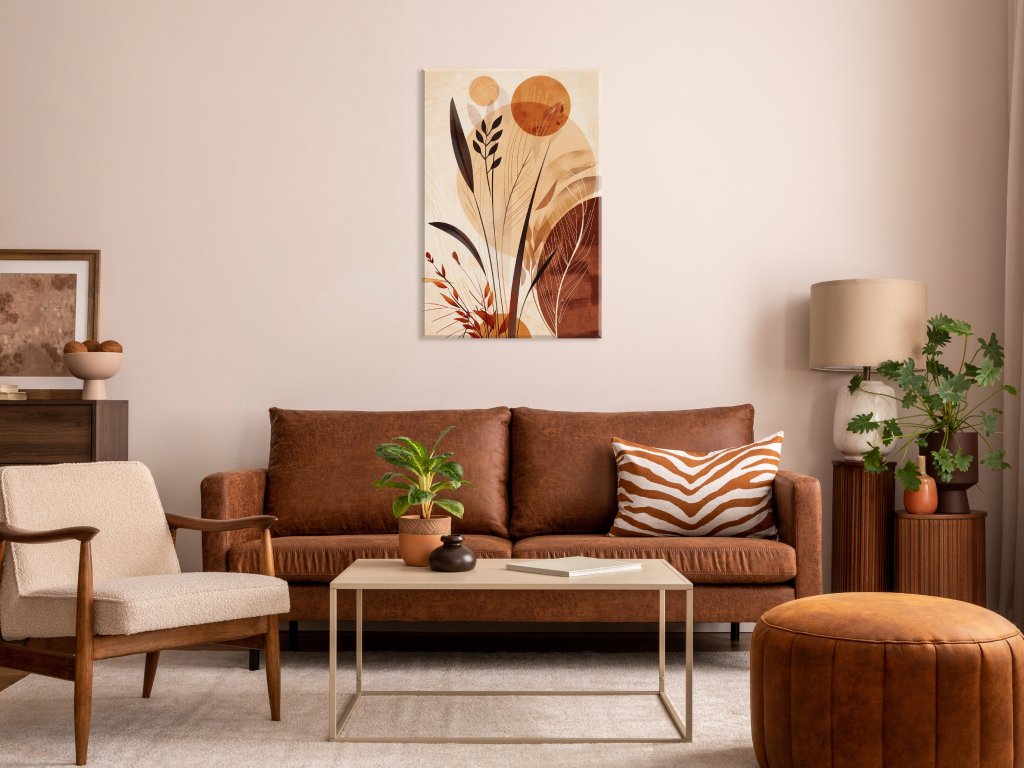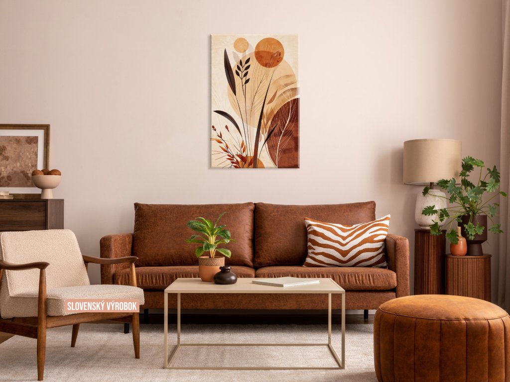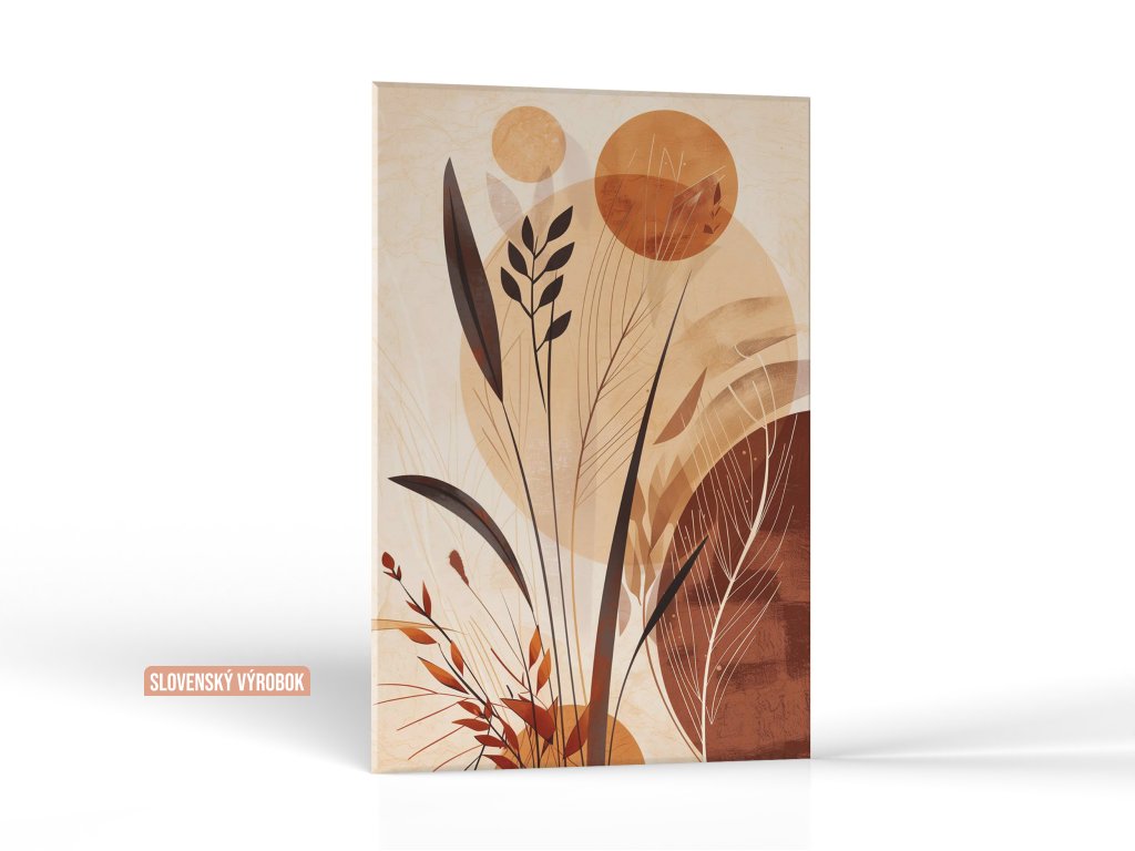 Tento abstraktný obraz zachytáva esenciu jesene prostredníctvom jemných línií a tvarov, ktoré evokujú rastliny a listy v jesennom období. Teplé odtiene oranžovej, hnedej a béžovej vytvárajú príjemný a harmonický dojem. Celková kompozícia obrazu pôsobí pokojne a vyvážene, pričom vyvoláva pocit spojenia s prírodou.