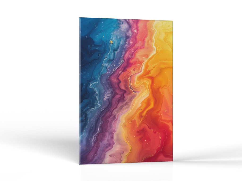 Na obraze sú zobrazené mäkké, tekuté prechody, ktoré vytvárajú elegantné línie plynúce od sytých modrých a fialových odtieňov do horúcich oranžových a červených farieb. Vytvára to dojem farebného prúdu, ktorý sa vlní a mení, s drobnými bublinkami a kvapkami, ktoré dodávajú textúru a detail. Pôsobenie obrazu je mimoriadne hypnotické.