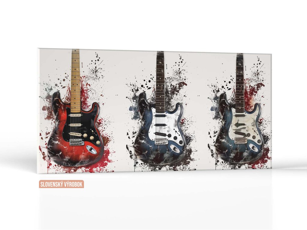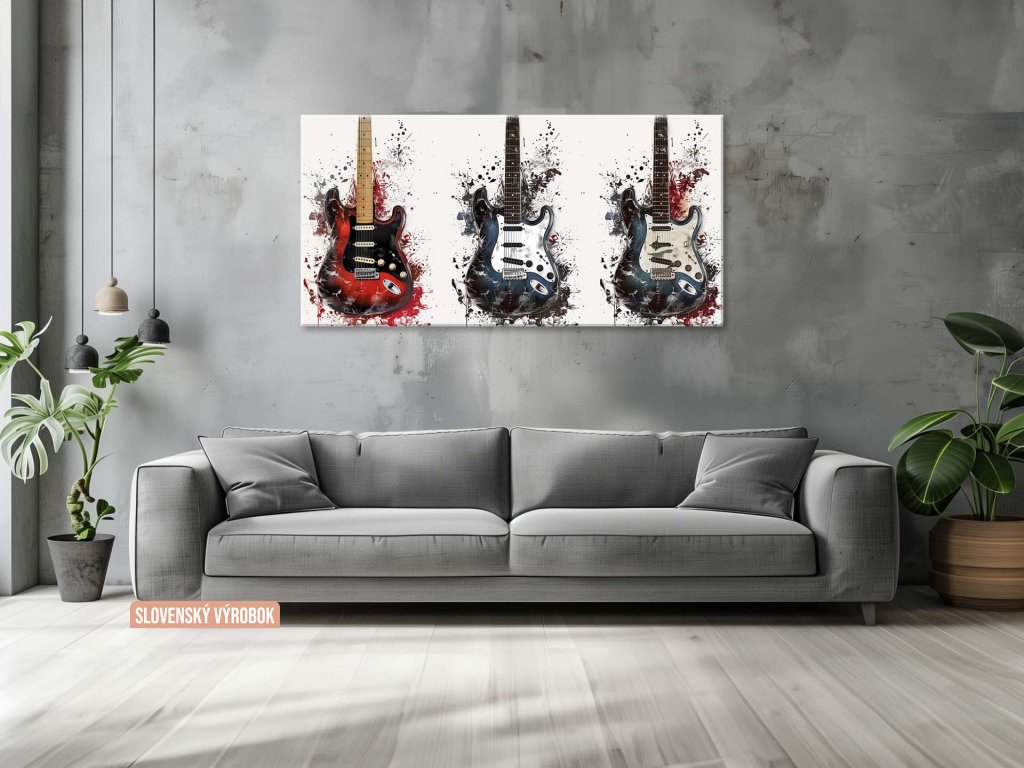 Tento obraz zachytáva tri elektrické gitary v rôznych odtieňoch, každá v unikátnom dizajne, umiestnené na jemnom bielom pozadí s abstraktnými čiernymi a červenými prvkami. Červená, čierna a modrá gitara vytvárajú kontrast, ktorý dodáva nadčasový dizajn. Výrazné škvrny a farebné odtiene na pozadí dodávajú obrazu dynamiku a energiu, čím symbolizujú silu a vplyv rockovej hudby.