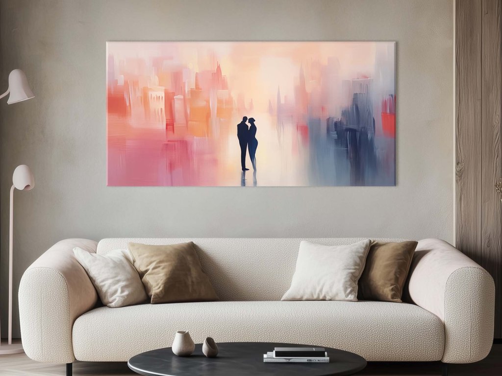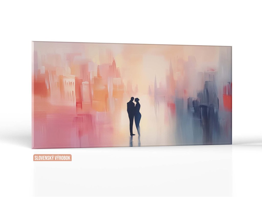 Obraz zachytáva dvoch ľudí stojacich oproti sebe, zobrazených ako siluety, obklopené pastelovými odtieňmi ružovej, oranžovej a modrej. Rozostreté kontúry mesta v pozadí vytvárajú jemný a nový nádych, pričom zdôrazňujú intimitu momentu medzi postavami. Tento obraz vyvoláva pocit pokoja, lásky a súznenia v hmlistom mestskom prostredí.
