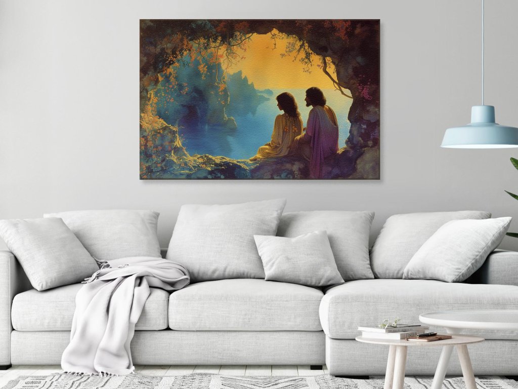 Obraz zobrazuje muža a ženu v tradičných róbach, ktorí sedia na skalnej vyhliadke obklopení kvetinami a výhľadom na pokojné modré vody. Ich pozornosť je upriamená na vzdialený západ slnka, ktorý oblohu farbí do oranžových a žltých odtieňov. Okolitá príroda a zvetrané skaly vytvárajú dojem odľahlej a tichej oázy, kde čas akoby sa zastavil.