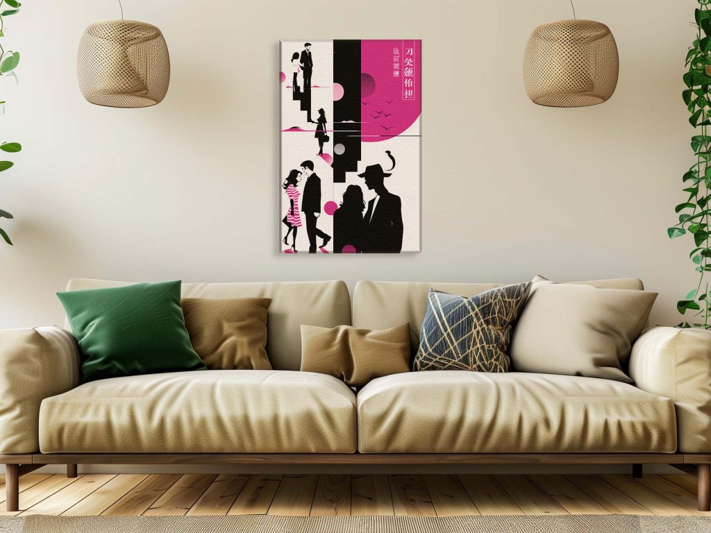 Obraz využíva hravé kontrasty medzi ružovou a čiernou na vytvorenie siluetných zobrazení ľudí v rôznych scénach. Vrchná časť ukazuje párik stojaci na schodoch, stred zobrazuje ich stret a dolná časť zobrazuje muža a ženu vo flirtovnom momente. Zdá sa, že obrázok rozpráva príbeh o láske a vzťahoch s použitím geometrických tvarov a silných farieb.