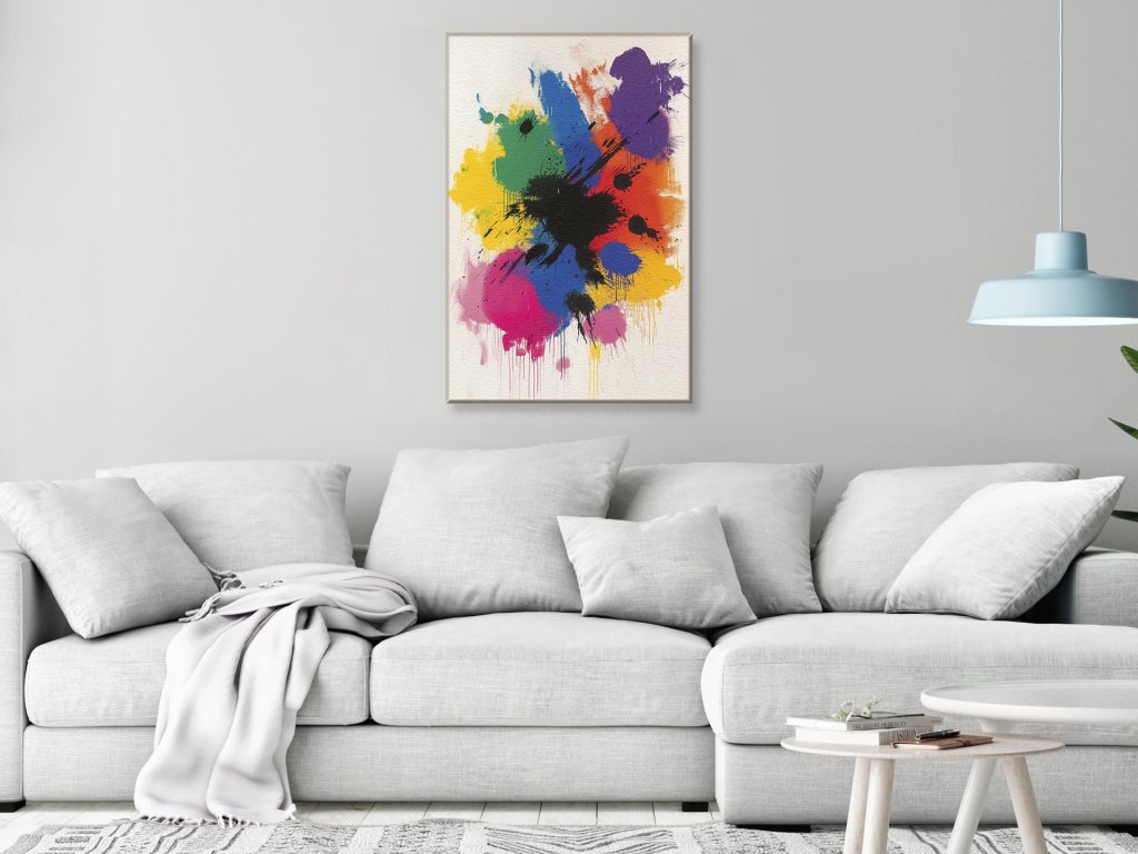 Obrázok zobrazuje živý abstraktný rozstrek rôznych farieb - modrej, žltej, čiernej, červenej a ružovej - ktoré vytvárajú dojem dynamického pohybu. Farby vyzerajú sviežo a energicky, a ich náhodné umiestnenie dáva dielu spontánnosť. Dripovanie farby smerom dole dodáva pocit gravitácie a pohybu.