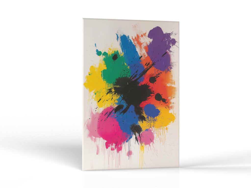 Abstraktné farebné škvrny rozstrekované na plátne.