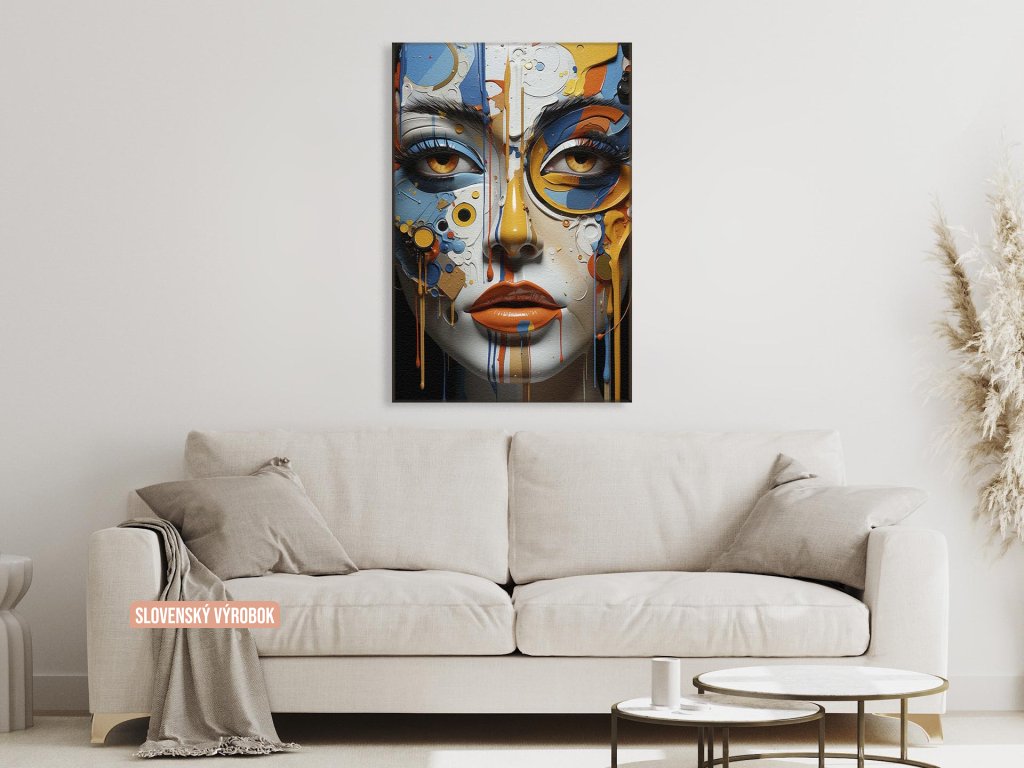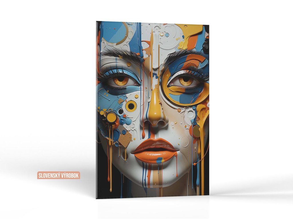Obraz zachytáva hyperrealistický portrét ženy, ktorý je prepojený so surrealistickými prvkami, akými sú roztekajúce sa farby a geometrické tvary. Výrazné oči a pery sú stredobodom kompozície, zatiaľ čo zvyšok tváre sa zdá byť rozpúšťaný v kaleidoskope živých farieb, čo vytvára silný kontrast medzi realitou a fantáziou. Celkový dojem je dynamický a vizuálne pôsobivý, s dôrazom na transformáciu a plynutie.