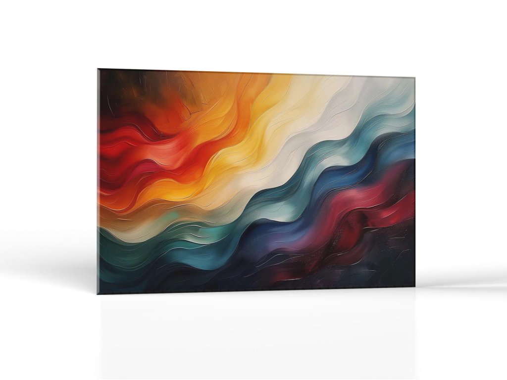 Tento obraz predstavuje silný vizuálny prúd farieb, ktorý symbolizuje bohatú paletu ľudských pocitov. Teplé odtiene prechádzajú od ohnivej oranžovej k jemnej žltej a bielym tónom, ktoré kontrastujú s hlbokými odleskami tmavomodrej a burgundskej. Každá farba plynie a vrství sa na ostatné, čo vytvára pocit dynamiky a pohybu. Obraz je ako metafora pre naše vnútorné zážitky, kde každá emócia má svoju farbu a každý závan je časťou väčšieho príbehu.
