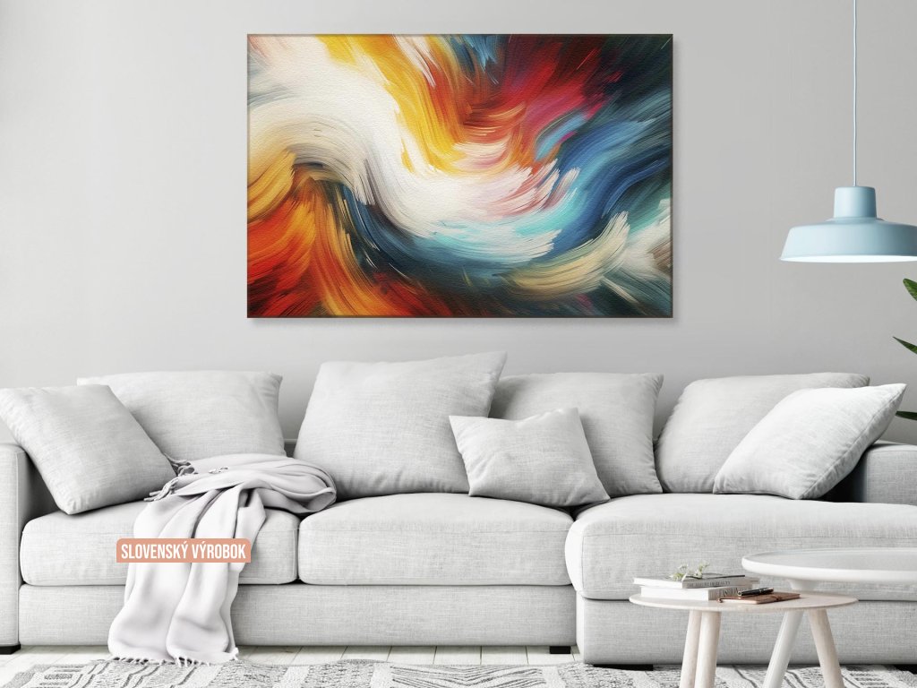 Obraz s názvom "Vír farieb" je vizuálna symfónia, kde sa tóny farieb stretávajú a miešajú v neustálom dynamickom tanci. Biela farba v strede obrazu evokuje svetlo a čistotu, zatiaľ čo okolo nej sa vrtiaci vír živých a teplých odtieňov oranžovej, červenej a žltej prechádza do chladnejšej palety modrej a zelenej, čím vyvoláva pocit energie, vášne a harmonického pohybu.
