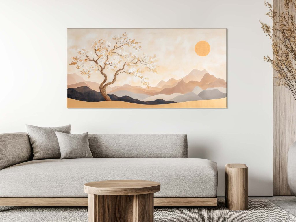 Obraz zobrazuje osamelý zakrivený strom rozkvitnutý jemnými kvetmi, ktorý kontrastuje s pokojnými tvarmi hôr v pozadí. Celá scéna je zahalená do teplých pastelových tónov, ktoré umocňujú pocit mieru a meditácie. Zlaté slnko visí nad krajinou ako tichý svedok plynutia času.