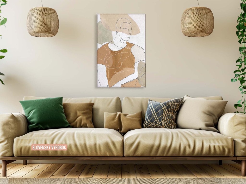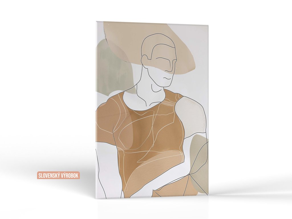 Obraz zobrazuje abstraktnú, zjednodušenú kresbu muža s kontúrami, ktoré naznačujú jeho siluetu a svalovú štruktúru. Použitie jemných odtieňov hnedej a zelenej dodáva kompozícii pokojnú atmosféru. Línie sú hladké a plynulé, čo vytvára pocit jednoduchosti a elegancie.