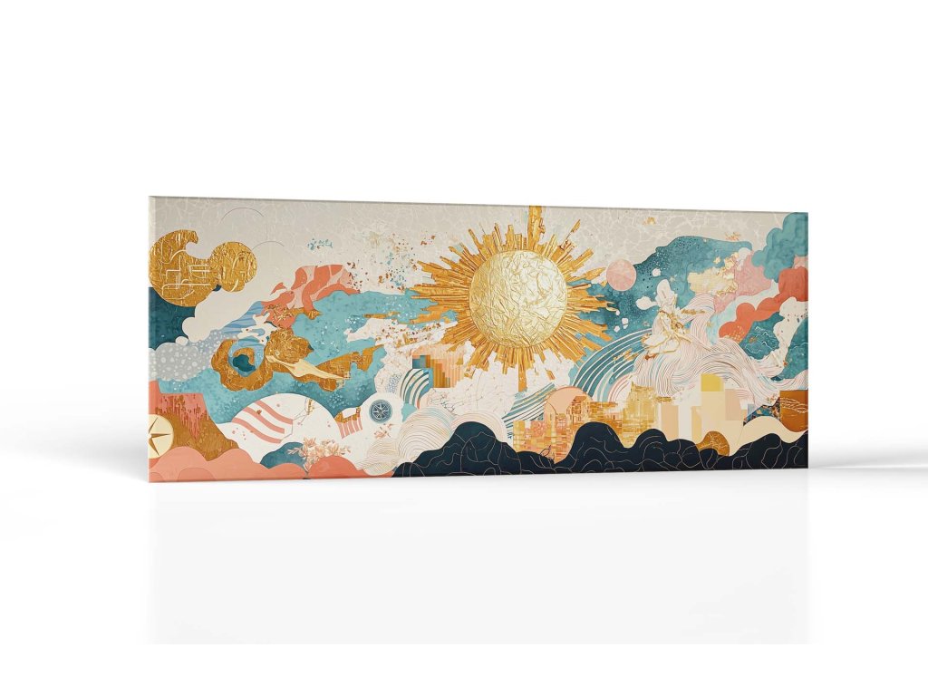 Tento obraz zobrazuje obrovské zlaté slnko, ktoré vyžaruje svetlo do komplexnej, farebne bohatej krajiny s geometrickými a abstraktnými tvarmi. Slnko je ústredným prvkom, obklopeným rôznorodými textúrami, vzormi a abstraktnými detailmi, ktoré symbolizujú prírodu a mesto. Celá kompozícia vytvára pocit harmónie medzi nebeskými prvkami a pozemskou krajinou, pričom zdôrazňuje dynamiku a prepojenosť sveta.