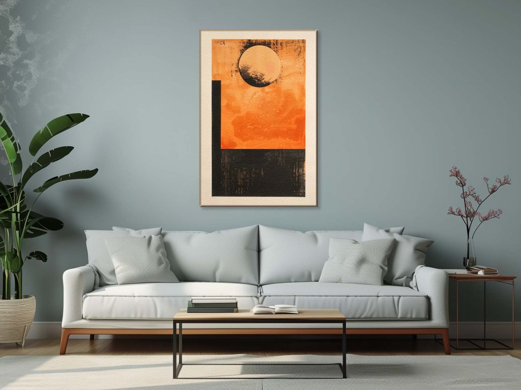 Na obraze je dominantné oranžové slnko na vrchu čiernej vertikálnej plochy, vytvára efekt východu alebo západu slnka. Textúry a vrstvenie farieb dodávajú dielu hĺbku a pohyb, zatiaľ čo minimalistický dizajn a geometrické prvky vytvárajú moderný a štýlový dojem. Obraz je príkladom, ako môže abstraktné umenie vyvolať pocit priestoru a atmosféry.