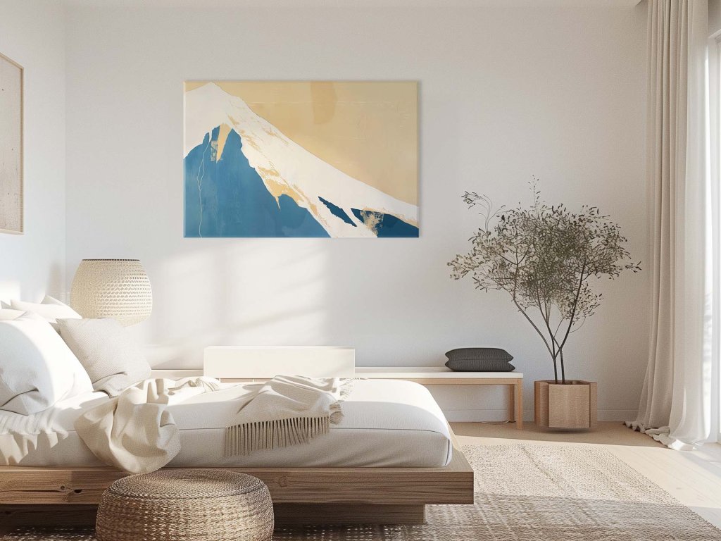 Tento obraz zobrazuje elegantné a minimalistické abstraktné vrcholy hôr pokrytých snehom. Farebné prechody medzi modrou a bielou farbou zachytávajú tichú krásu zimnej krajiny. Svetlé tóny na pozadí kontrastujú s tmavšími odtieňmi v popredí, čím vytvárajú dojem hlbokej a pokojnej zimnej atmosféry.