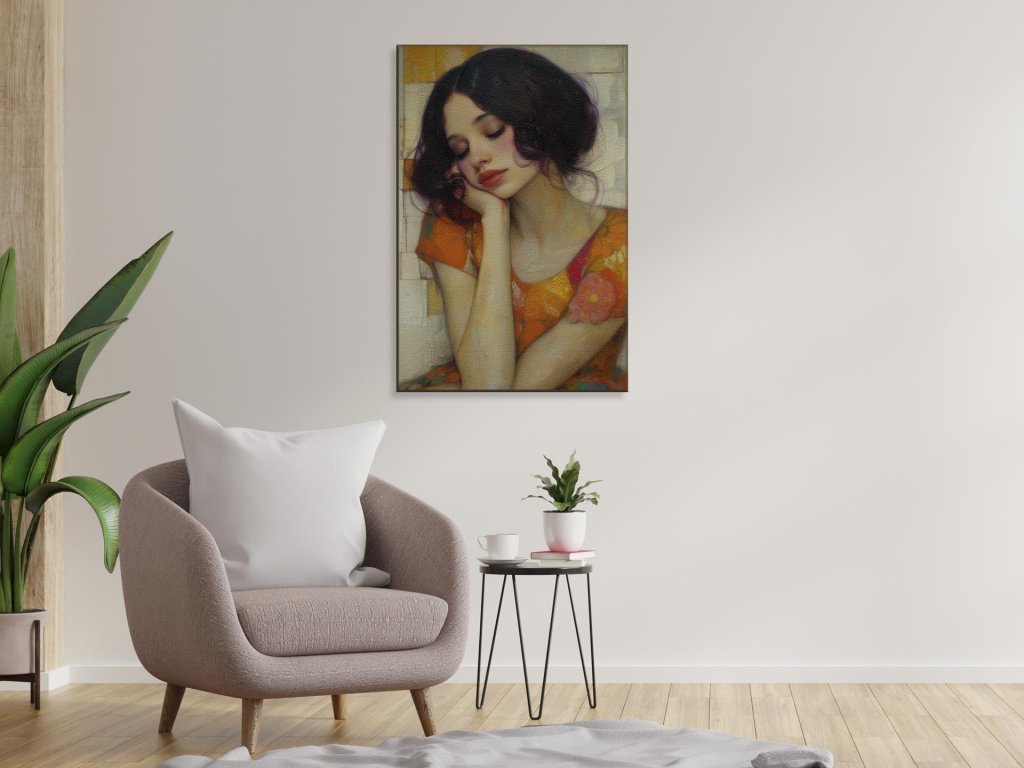 Obraz predstavuje mladú ženu s jemnými črtami tváre, ktorá má zatvorené oči a vyznieva pokojne a zadumane. Je oblečená v oranžovom odeve s kvetinovým vzorom a opiera si hlavu o ruku v geste, ktoré vyjadruje rozjímanie alebo odpočinok. Pozadie je tvorené abstraktnou mozaikou, ktorá pridáva k celkovému umeleckému výrazu.