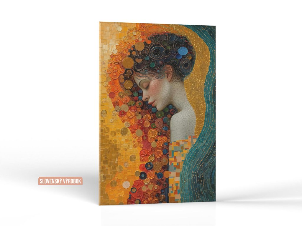 Portrét z profilu zobrazuje mladú ženu s pokojným výrazom, zavretými očami a s farebnými kruhovými ornamentmi zdobiacimi jej vlasy a šat. Obraz pripomína mozaiku, kde sa prelínajú zlaté, oranžové a modré odtiene, vytvárajúc dojem hlbokého pokoja a krásy. V pozadí dominuje zlatá farba, ktorá spolu s ostatnými farbami vytvára kompozíciu, pôsobiacu majestátne a upokojujúco.
