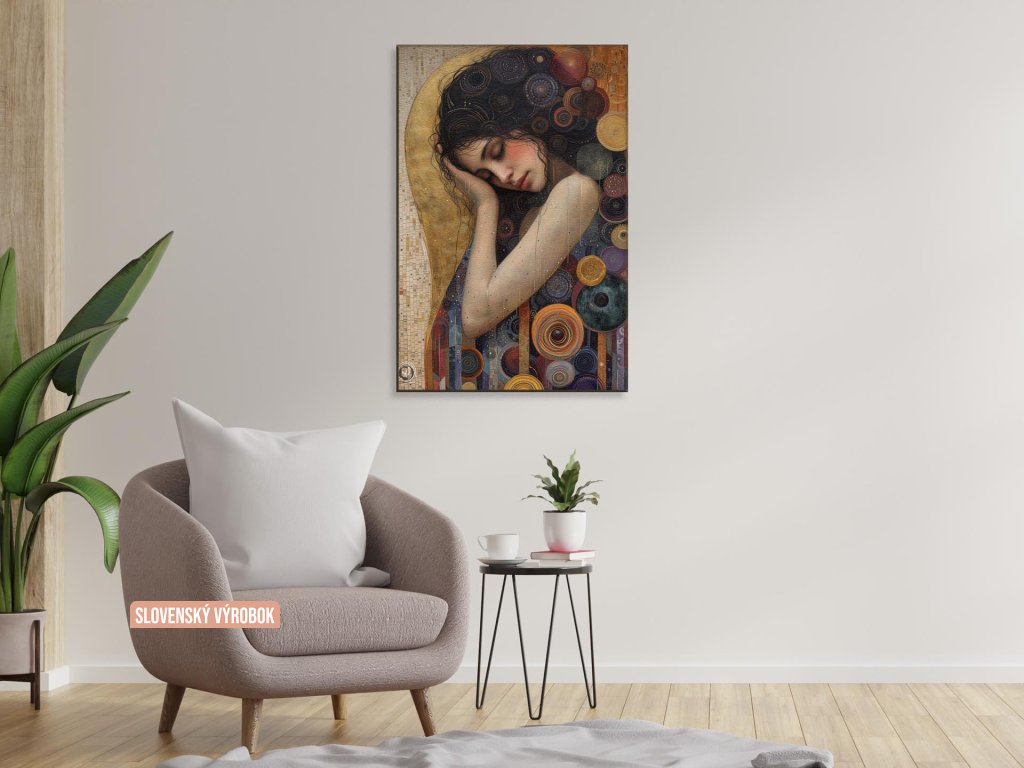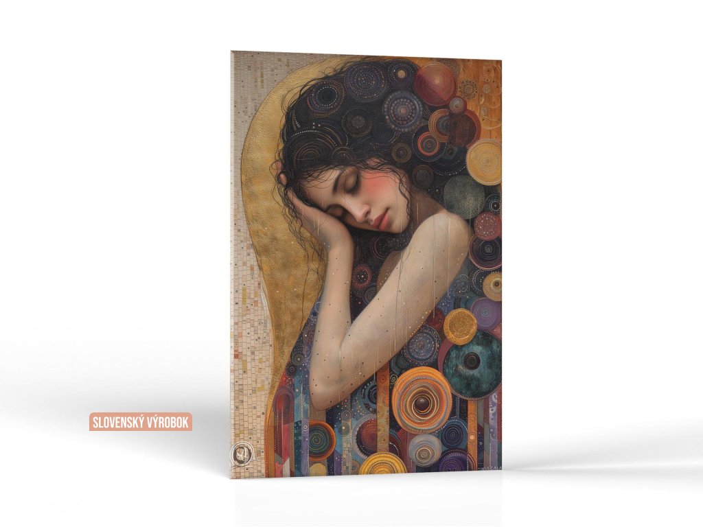 Obraz zachytáva ženu so zatvorenými očami, opretú o svoju ruku, zdá sa byť pokojne zasnená. Jej postava a pozadie sú vyplnené bohatými, abstraktnými vzormi a kruhmi, ktoré pripomínajú mozaiku. Farebná paleta je teplá a pestrá, prevažujú tu zlaté a modré odtiene, ktoré vytvárajú dojem luxusu a umeleckej krásy.