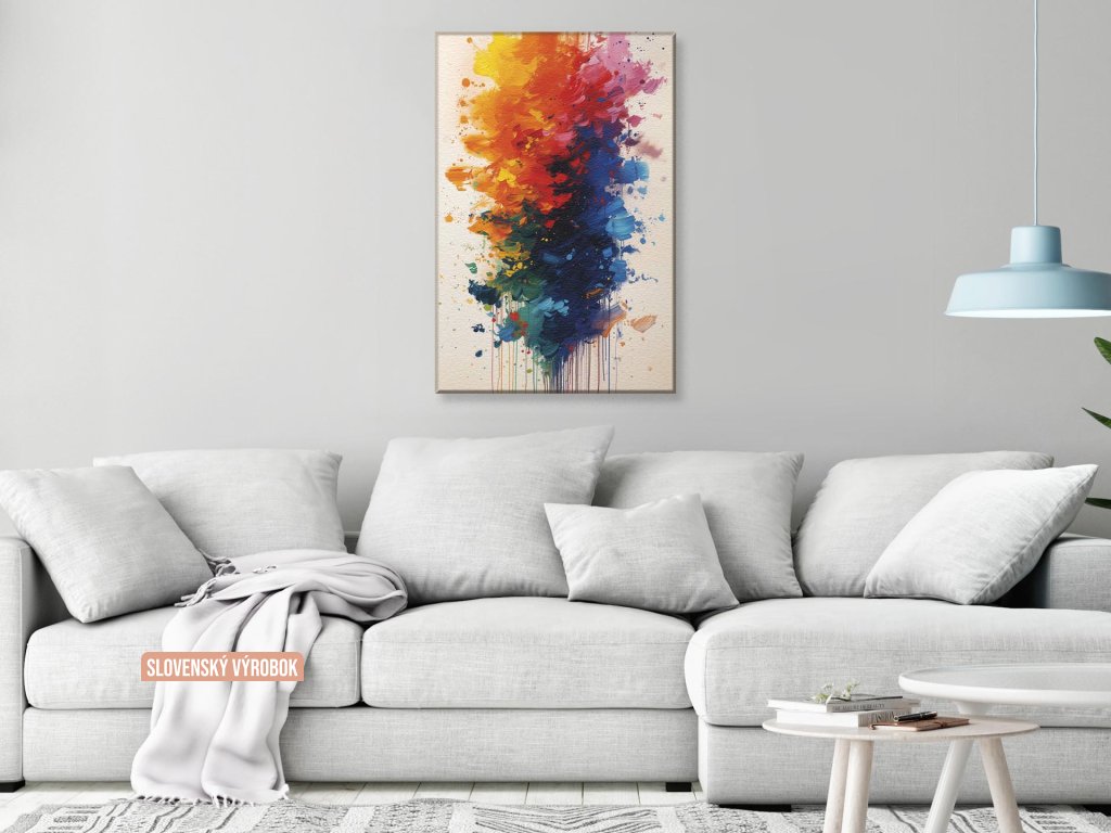 Tento obraz je vizuálnym predstavením širokého spektra farieb, od teplých žltých a červených tónov prechádzajúcich do chladných modrých a zelených, ktoré spolu vytvárajú dynamický a plynulý prechod. Štetce a kvapky farby sú aplikované s energiou a spontánnosťou, čo vytvára bohatú textúru a hĺbku. Zdá sa, že farby tečú z horného ľavého rohu do dolného pravého, čo dodáva dielu pocit pohybu.