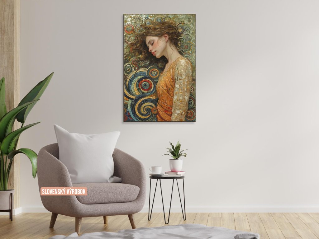 Obraz zobrazuje ženu s pokojným výrazom, jej hlava je sklonená a oči zavreté, čo vyvoláva dojem snenia alebo hlbokého uvoľnenia. Jej hnedé vlasy sú rozprestreté do komplexného pozadia, ktoré pripomína pestrofarebnú mozaiku so špirálovými a kruhovými motívmi. Tento obraz je vizuálne bohatý, s dôrazom na detail a textúru, čo vytvára silnú atmosféru a hĺbku.