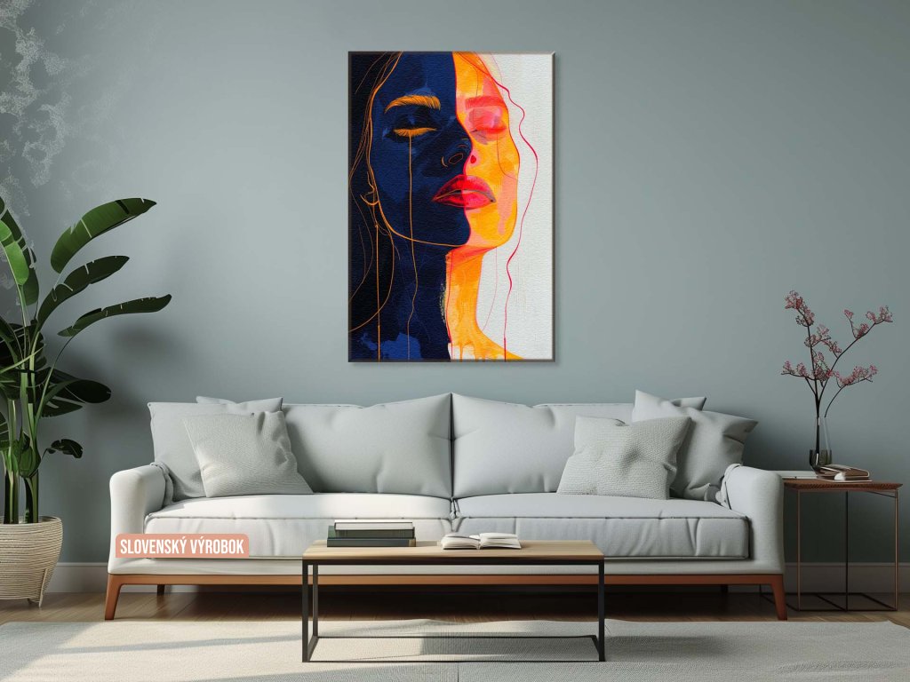 Na obraze sú zobrazené dve tváre v profilovej perspektíve, kde jedna je vyobrazená modrými a druhá oranžovými tónmi s červenými líniami, ktoré akcentujú ich kontúry. Dynamický vplyv je dosiahnutý prekrývaním farieb a línii, čím sa vytvára ilúzia hĺbky a emocionálnej energie. Výrazné farby a hravé líniové prvky vytvárajú pocit pohybu a živosti.