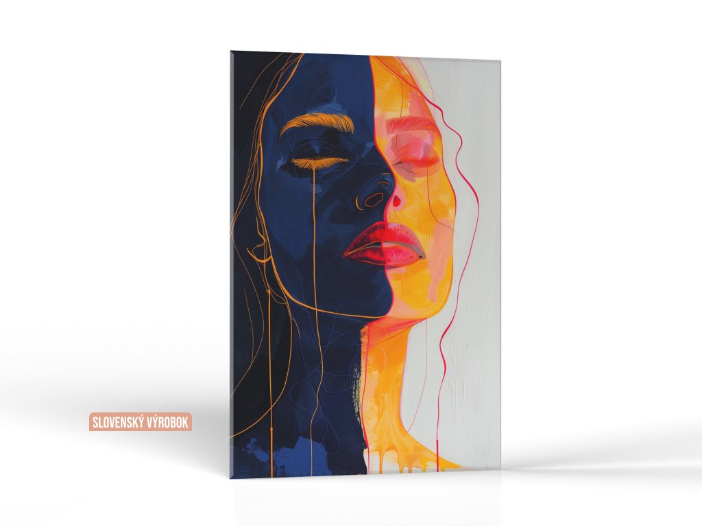 Abstraktný portrét dvoch prekrývajúcich sa tvárí v kontrastných farbách.